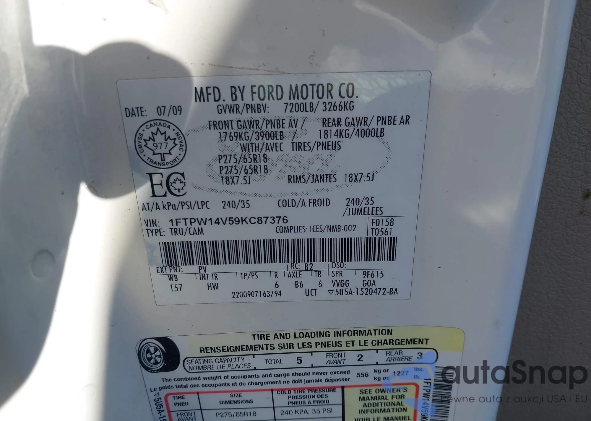 LOT: 43470705 VIN: 1FTPW14V59KC87376