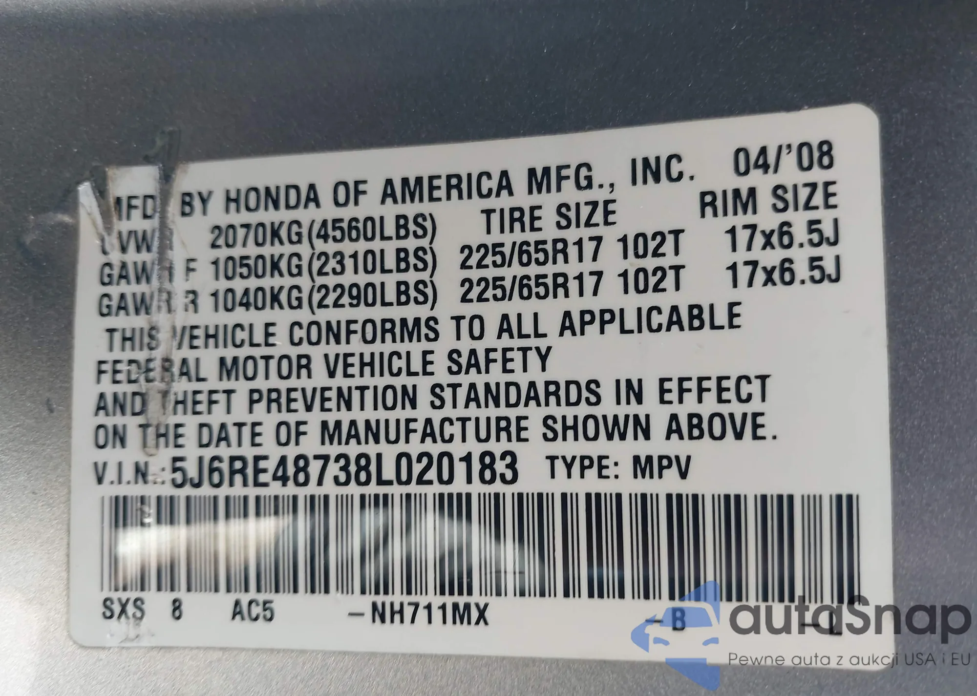 • VIN 5J6RE48738L020183