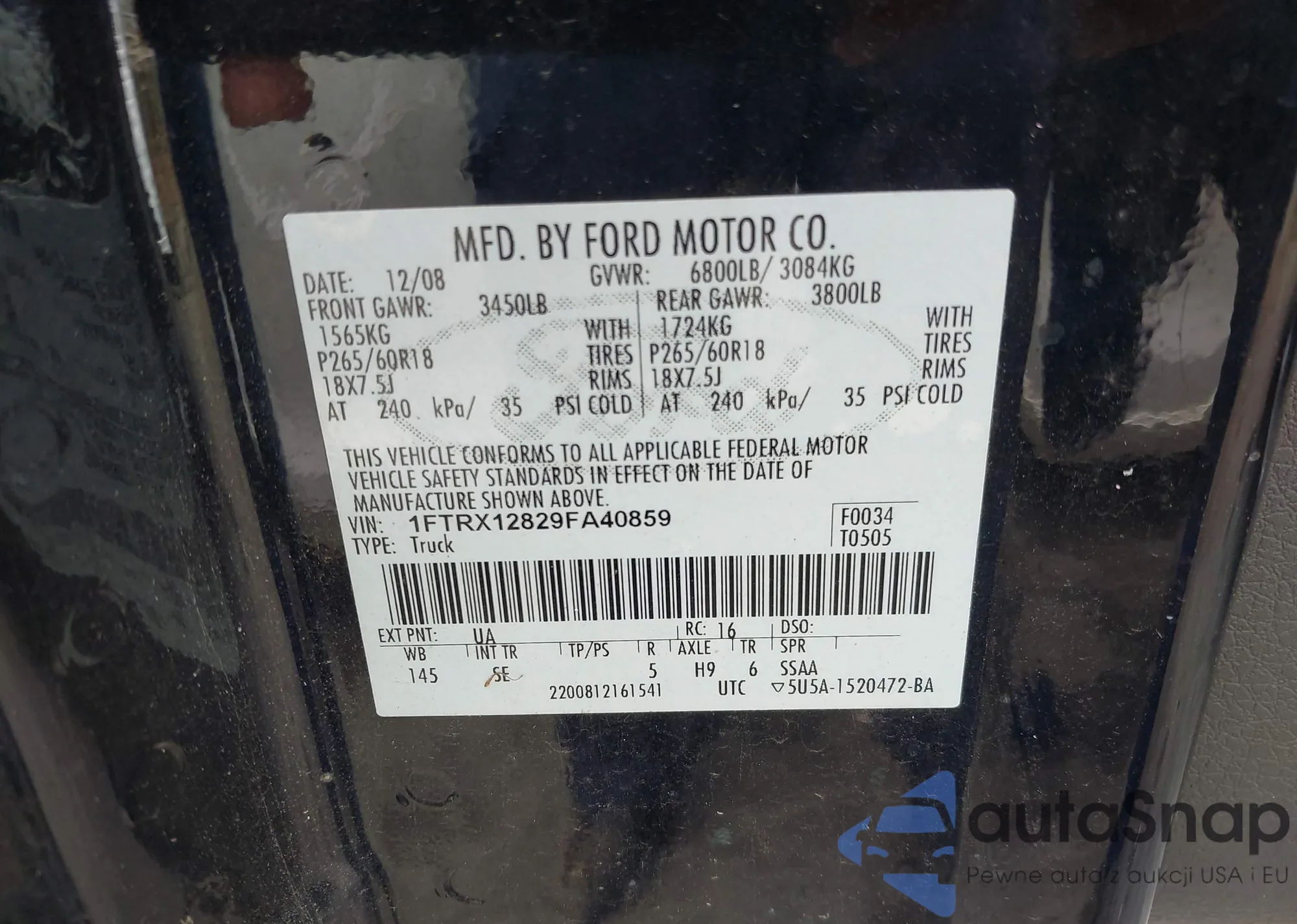 LOT: 43434826 VIN: 1FTRX12829FA40859