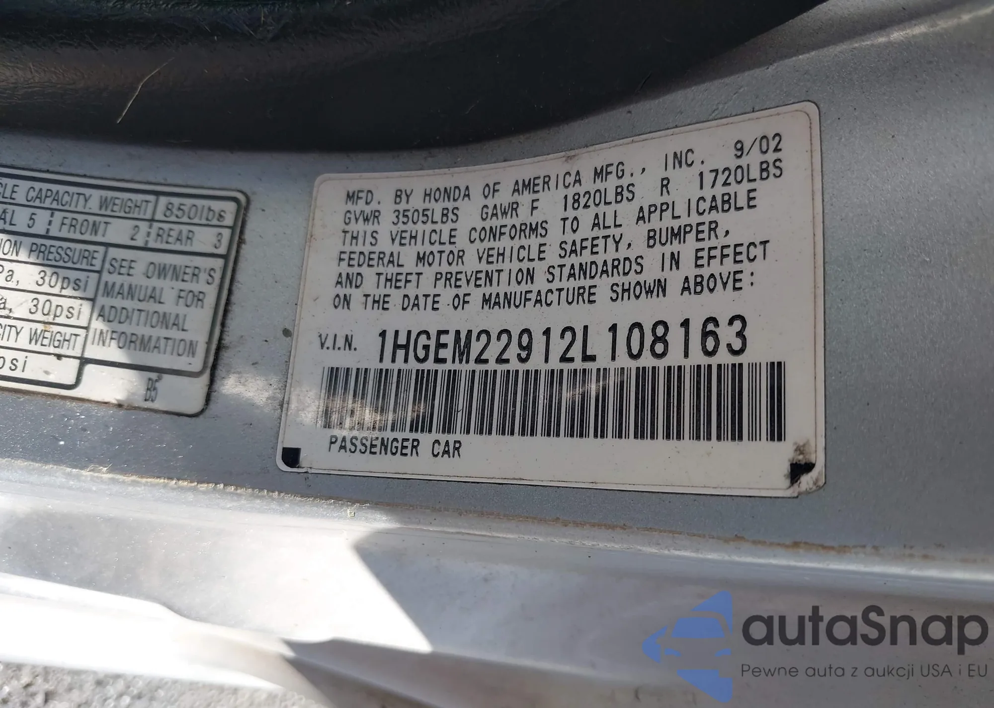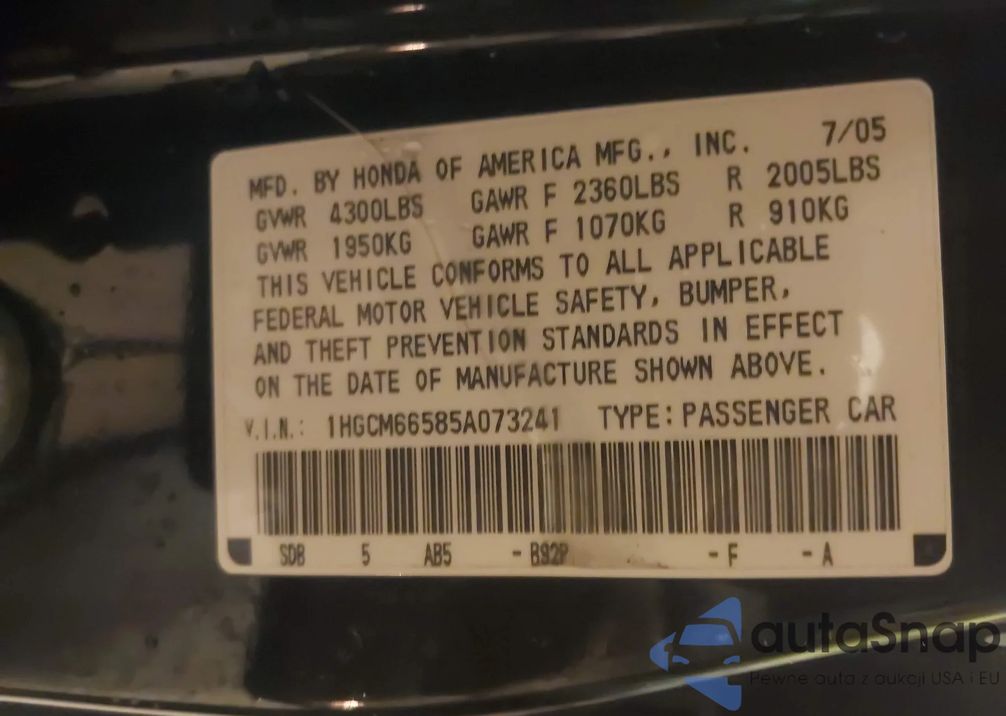 LOT: 43444845 VIN: 1HGCM66585A073241