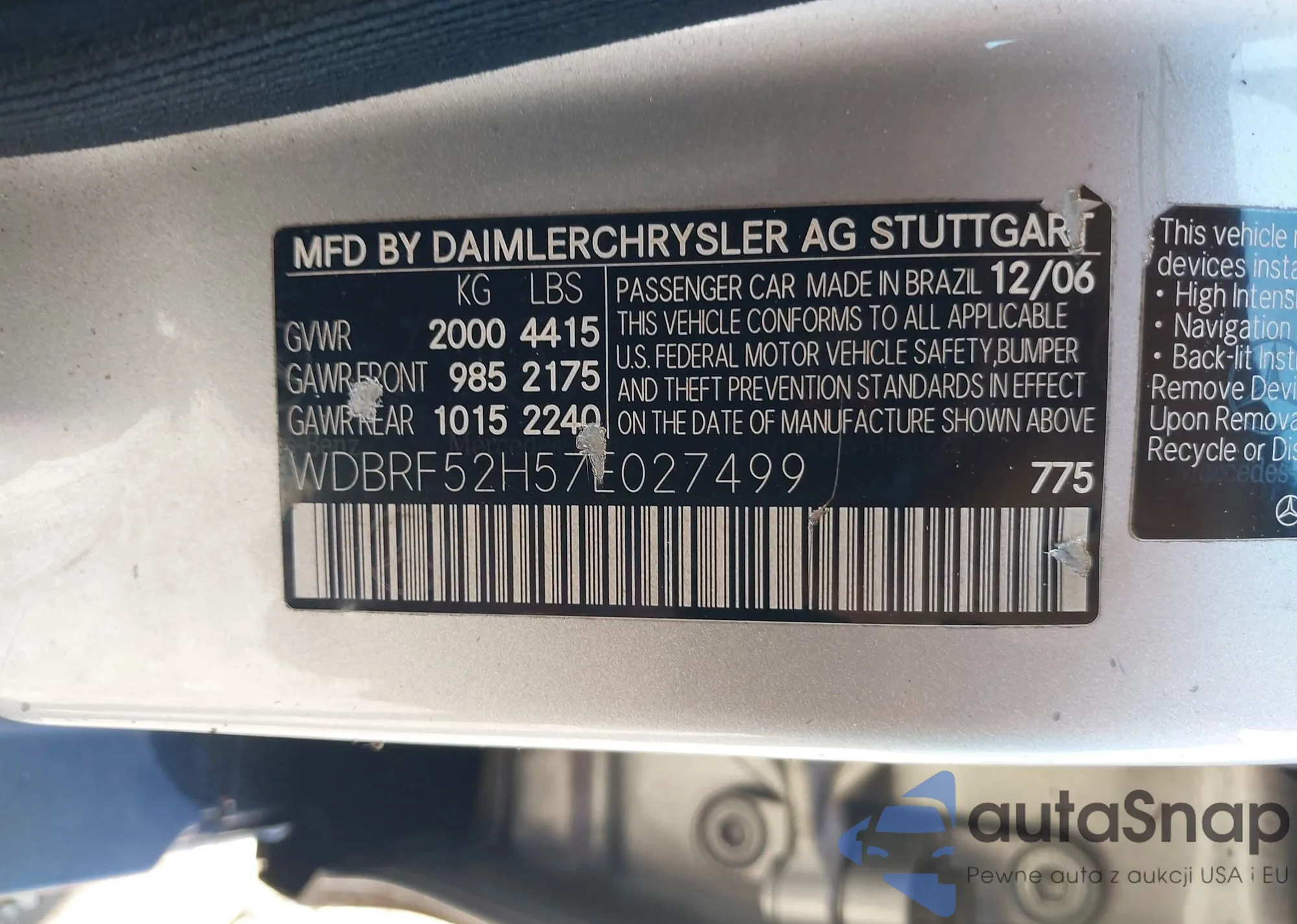 LOT: 43476960 VIN: WDBRF52H57E027499