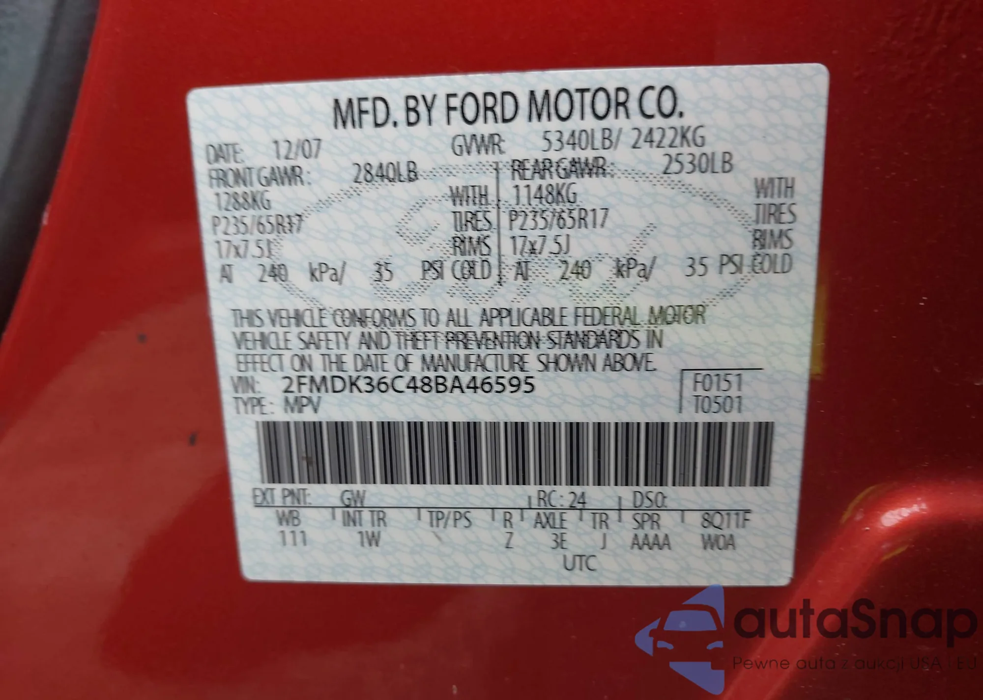 • VIN 2FMDK36C48BA46595