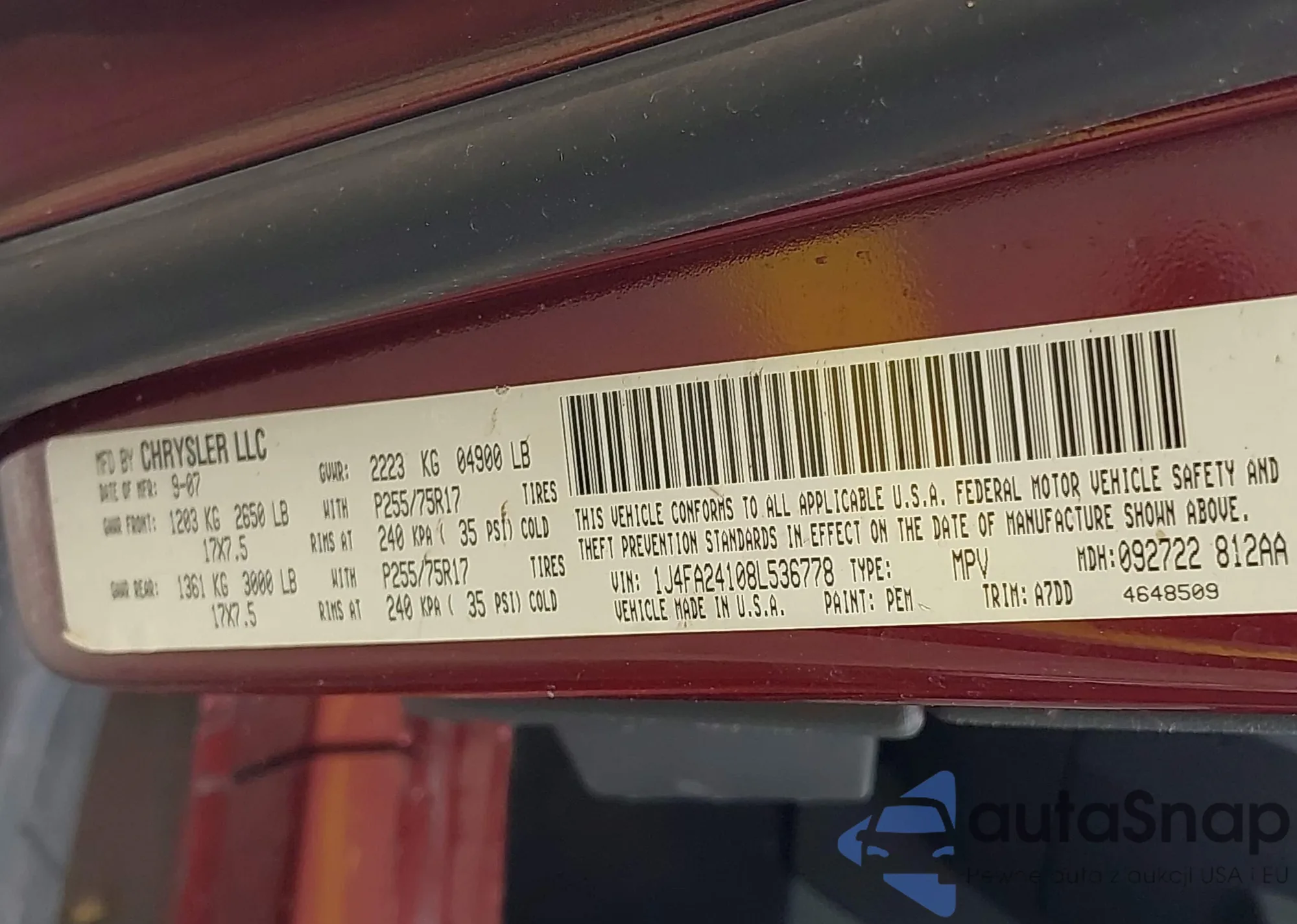 LOT: 43574149 VIN: 1J4FA24108L536778