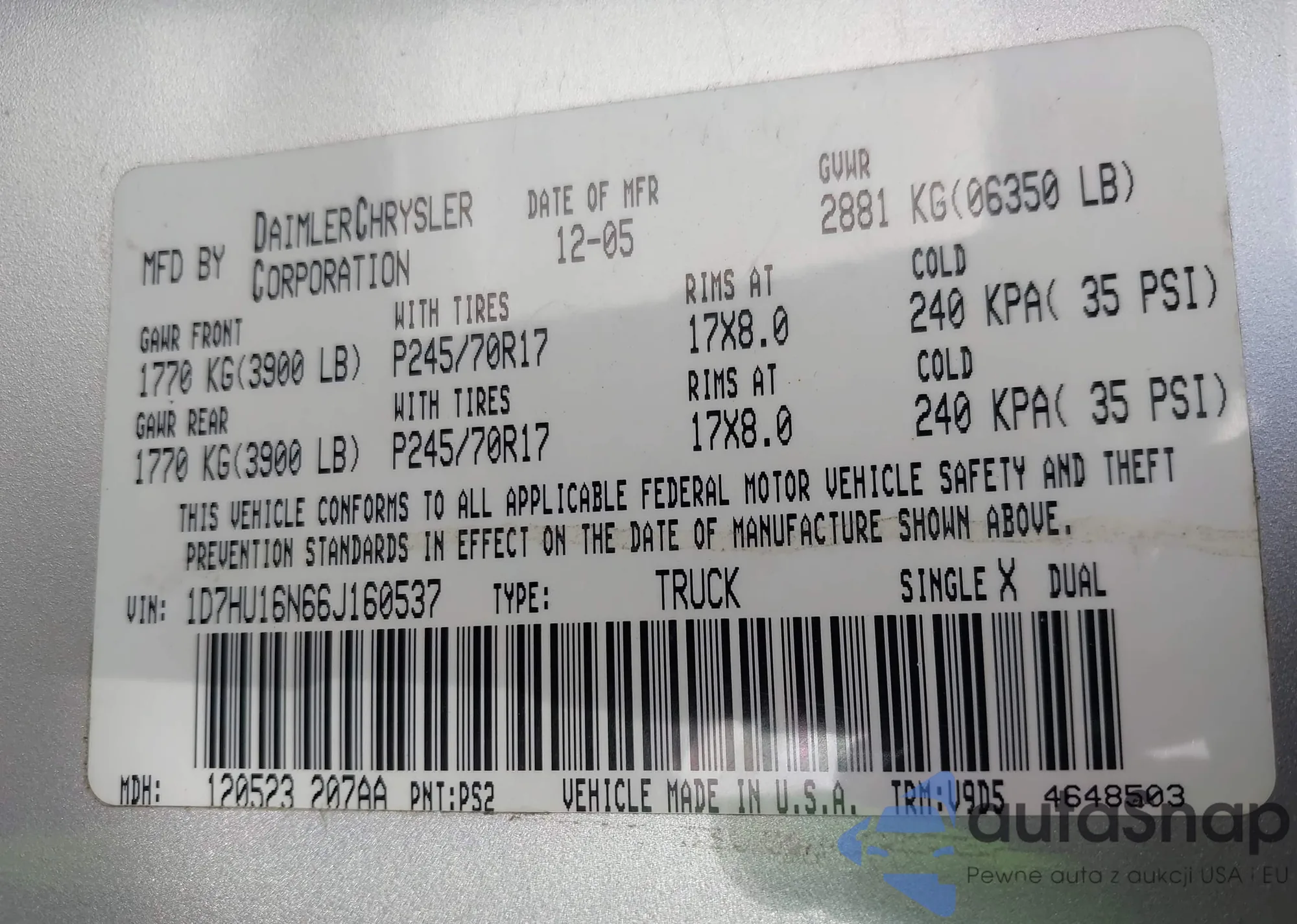 LOT: 43594493 VIN: 1D7HU16N66J160537