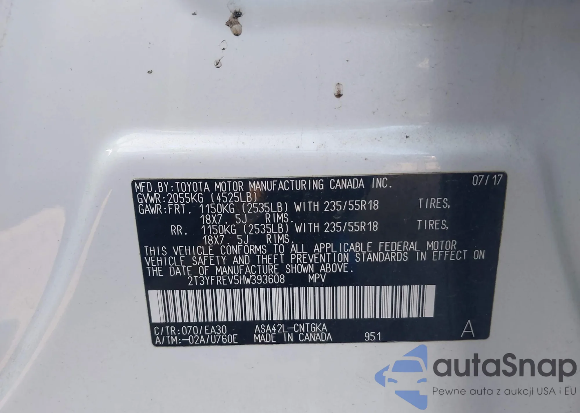 LOT: 43212160 VIN: 2T3YFREV5HW393608
