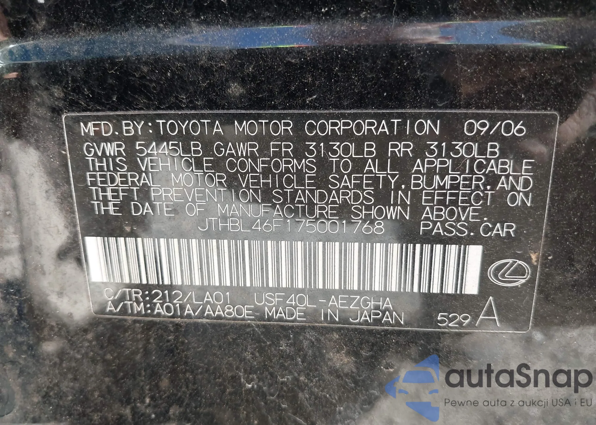 LOT: 43538488 VIN: JTHBL46F175001768