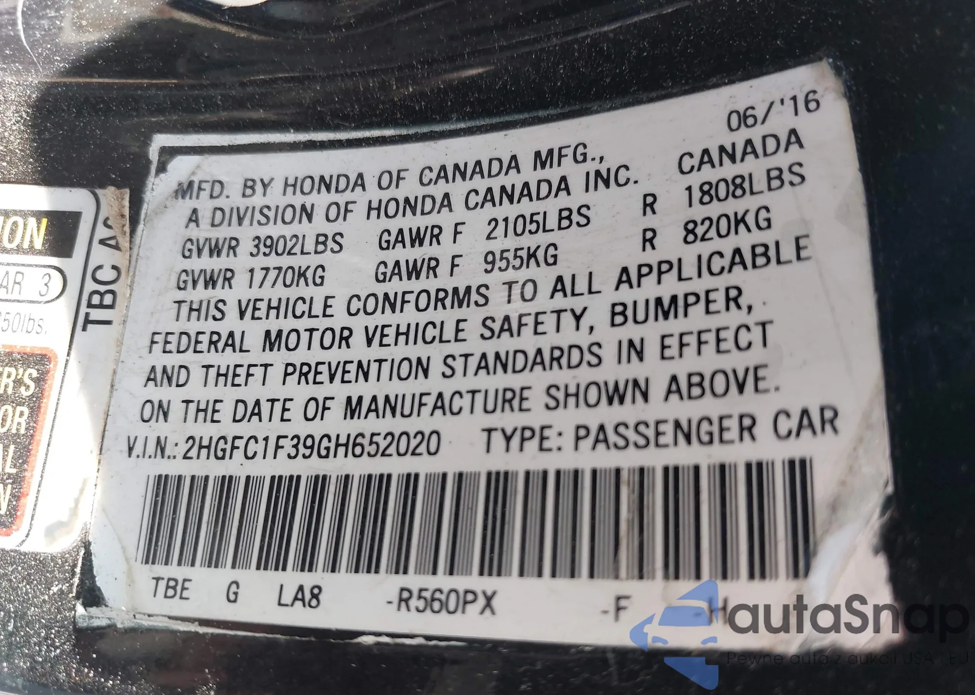 LOT: 43153385 VIN: 2HGFC1F39GH652020