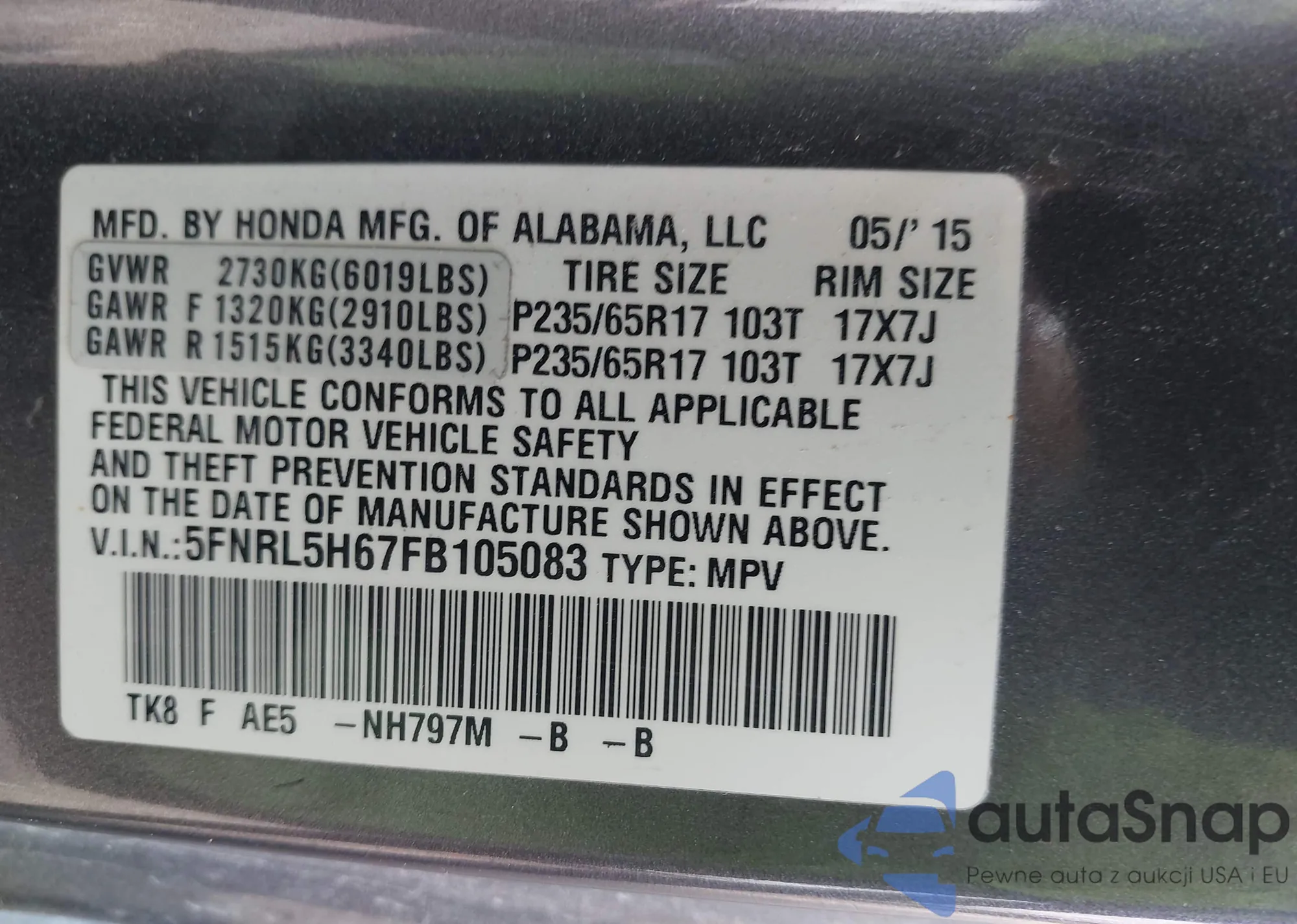 • VIN 2HKRM4H45GH667735