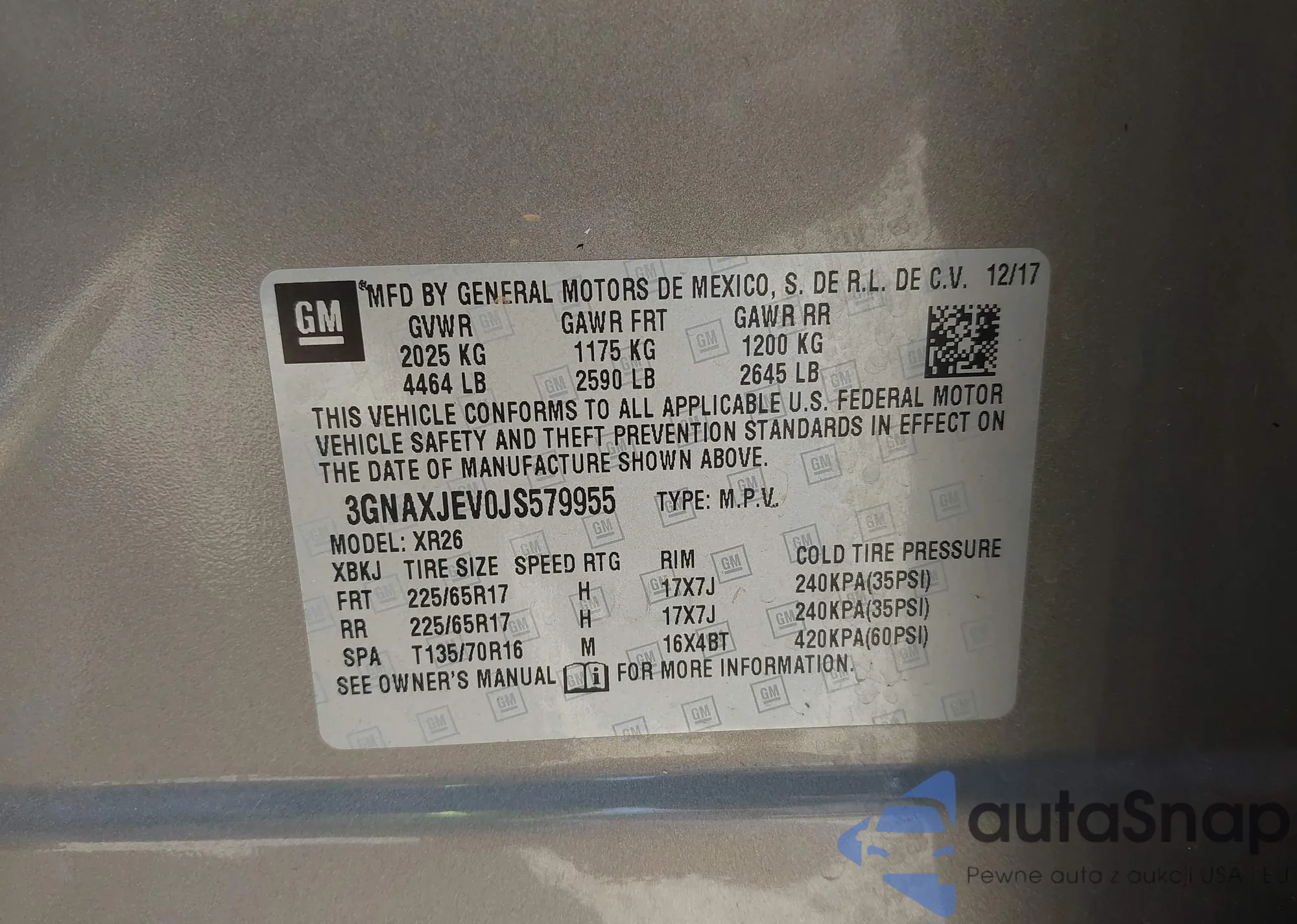 LOT: 43207758 VIN: 3GNAXJEV0JS579955