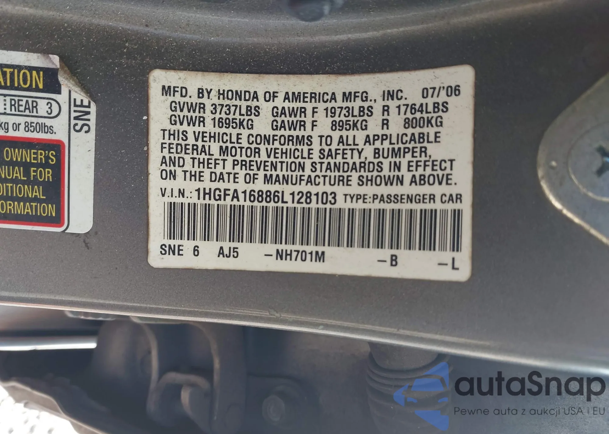 LOT: 43216200 VIN: 1HGFA16886L128103