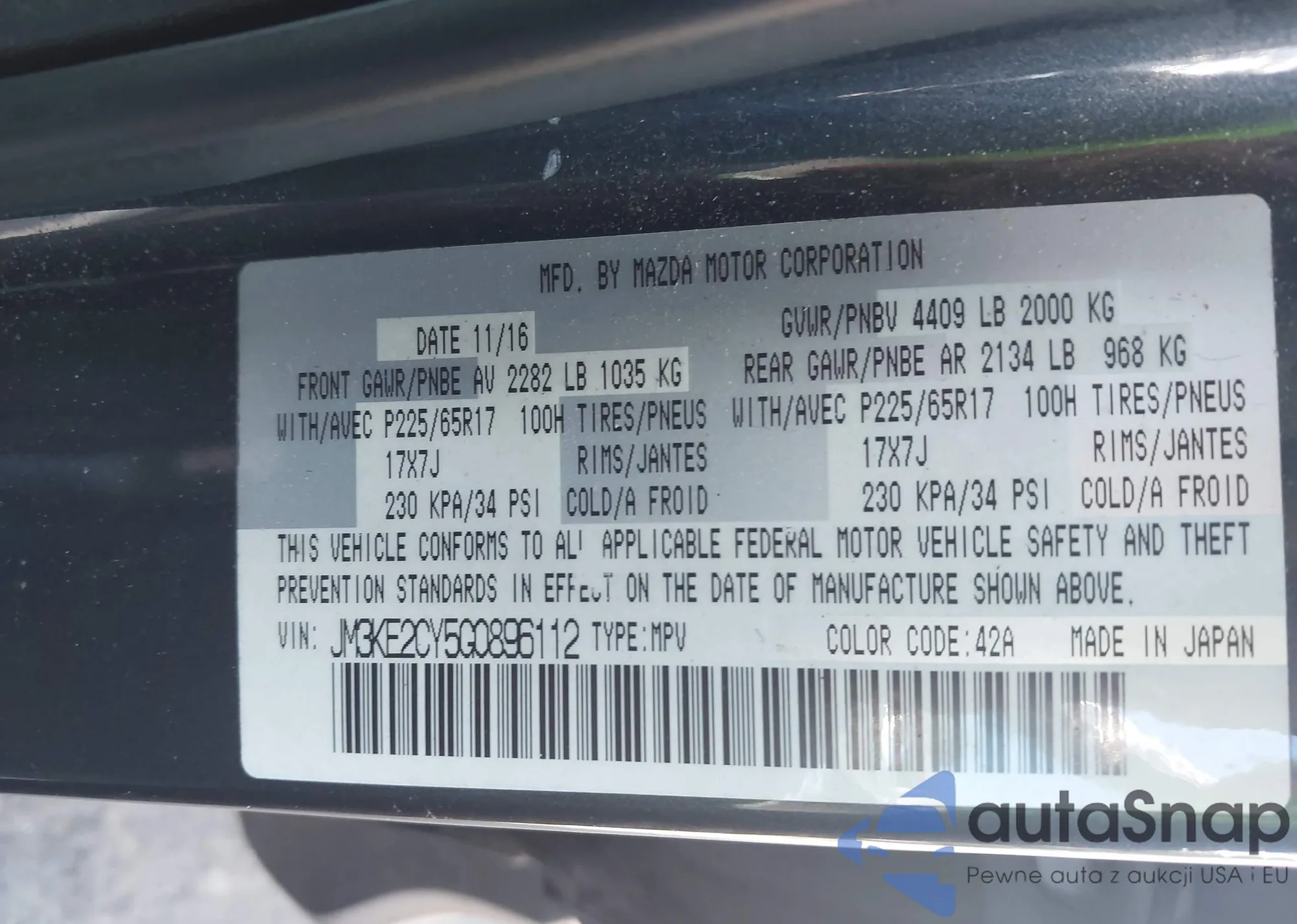 LOT: 43286430 VIN: JM3KE2CY5G0896112