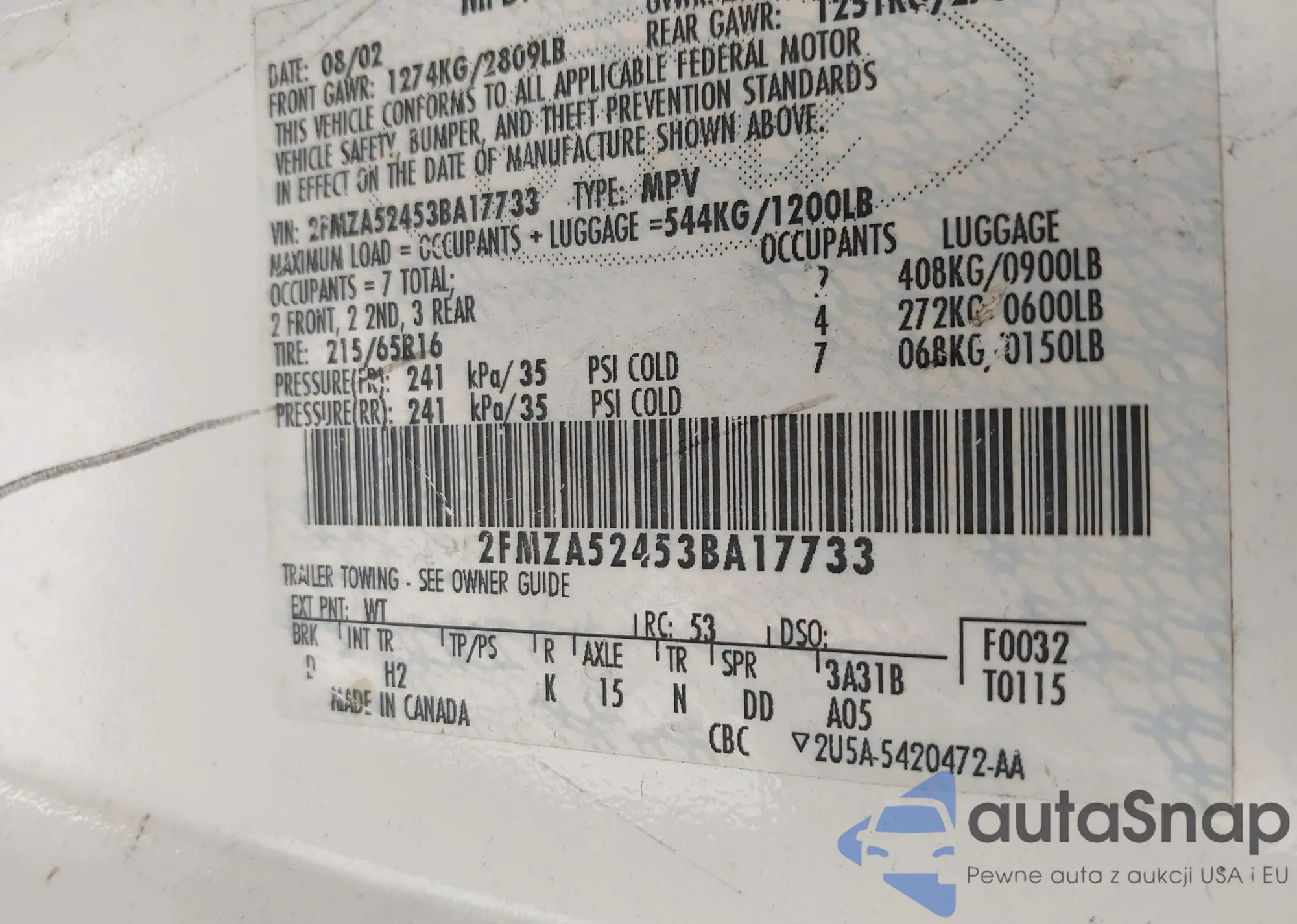 LOT: 43274520 VIN: 2FMZA52453BA17733