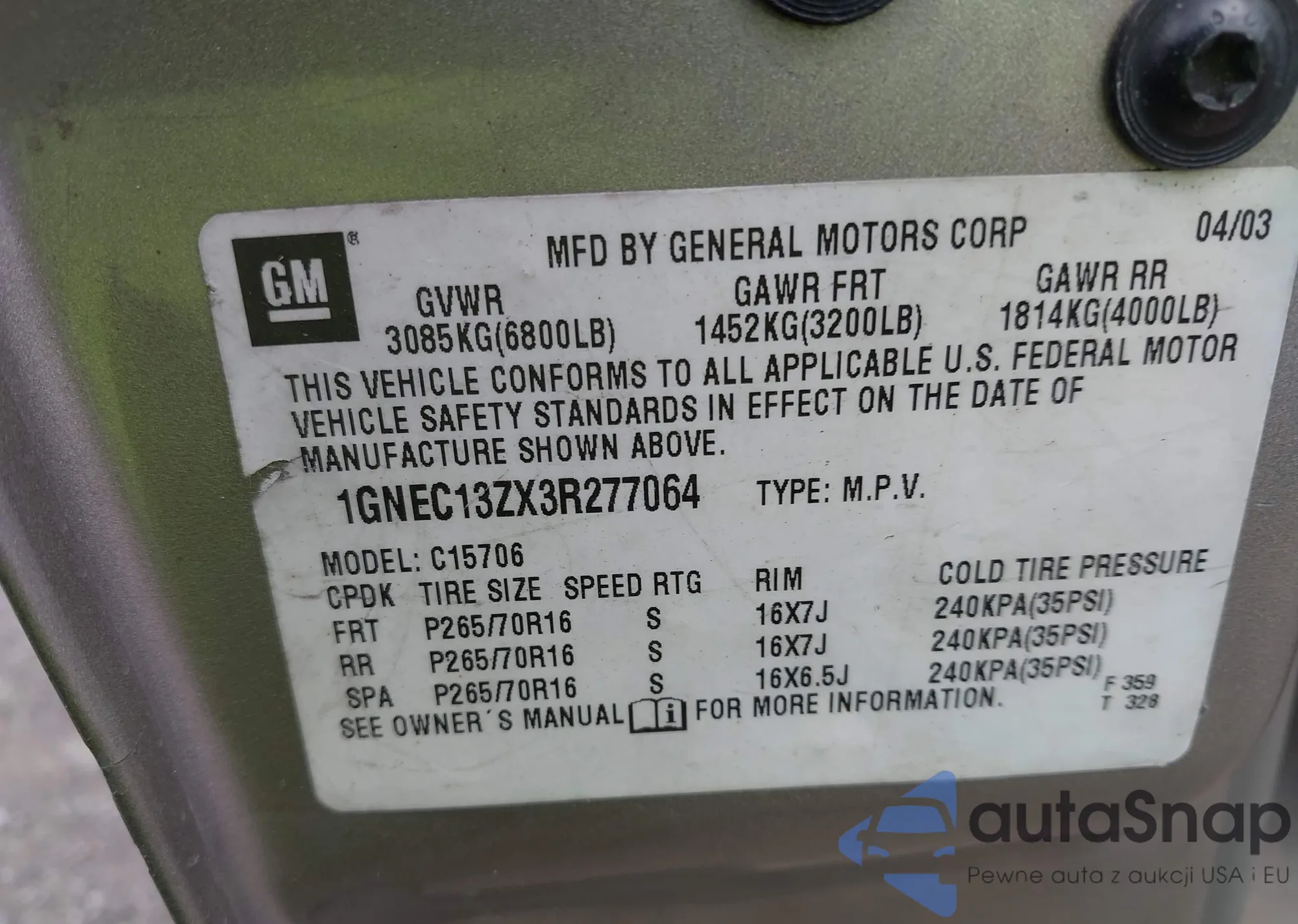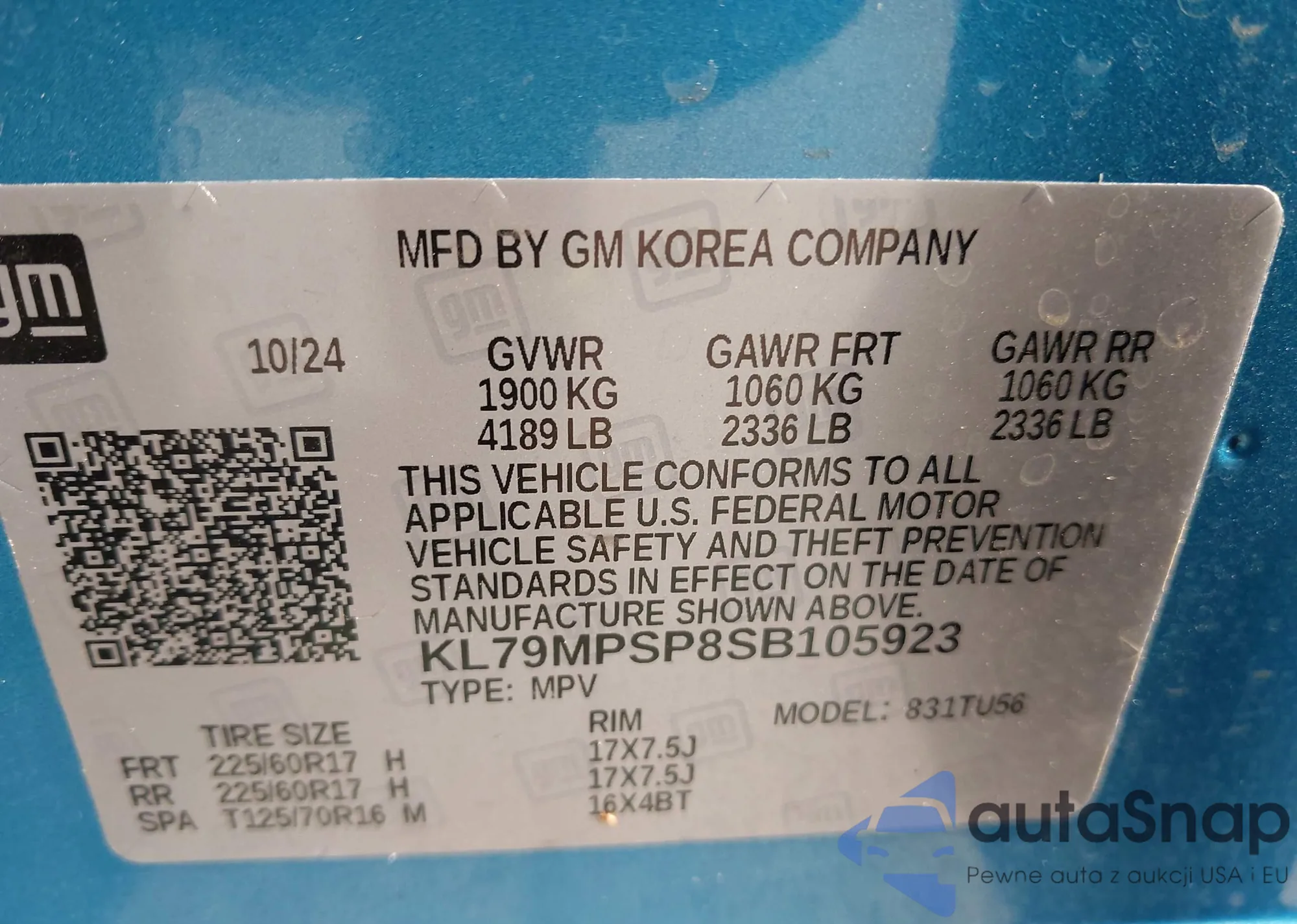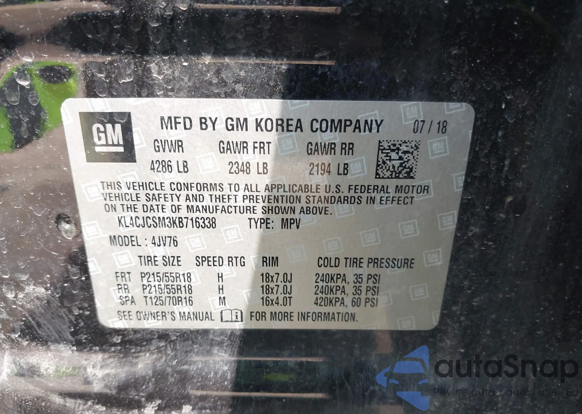• VIN KL4CJCSM3KB716338