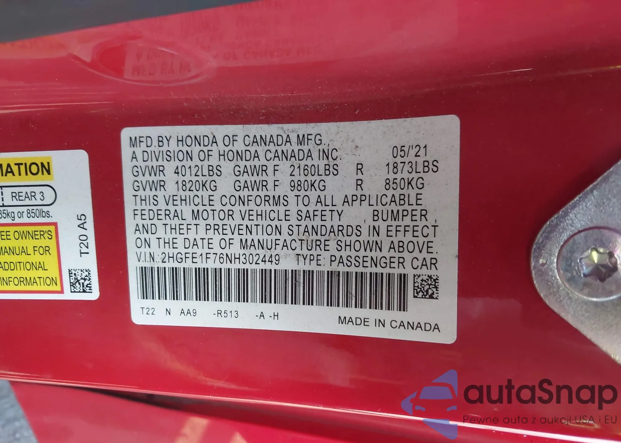 • VIN 2HGFE1F76NH302449
