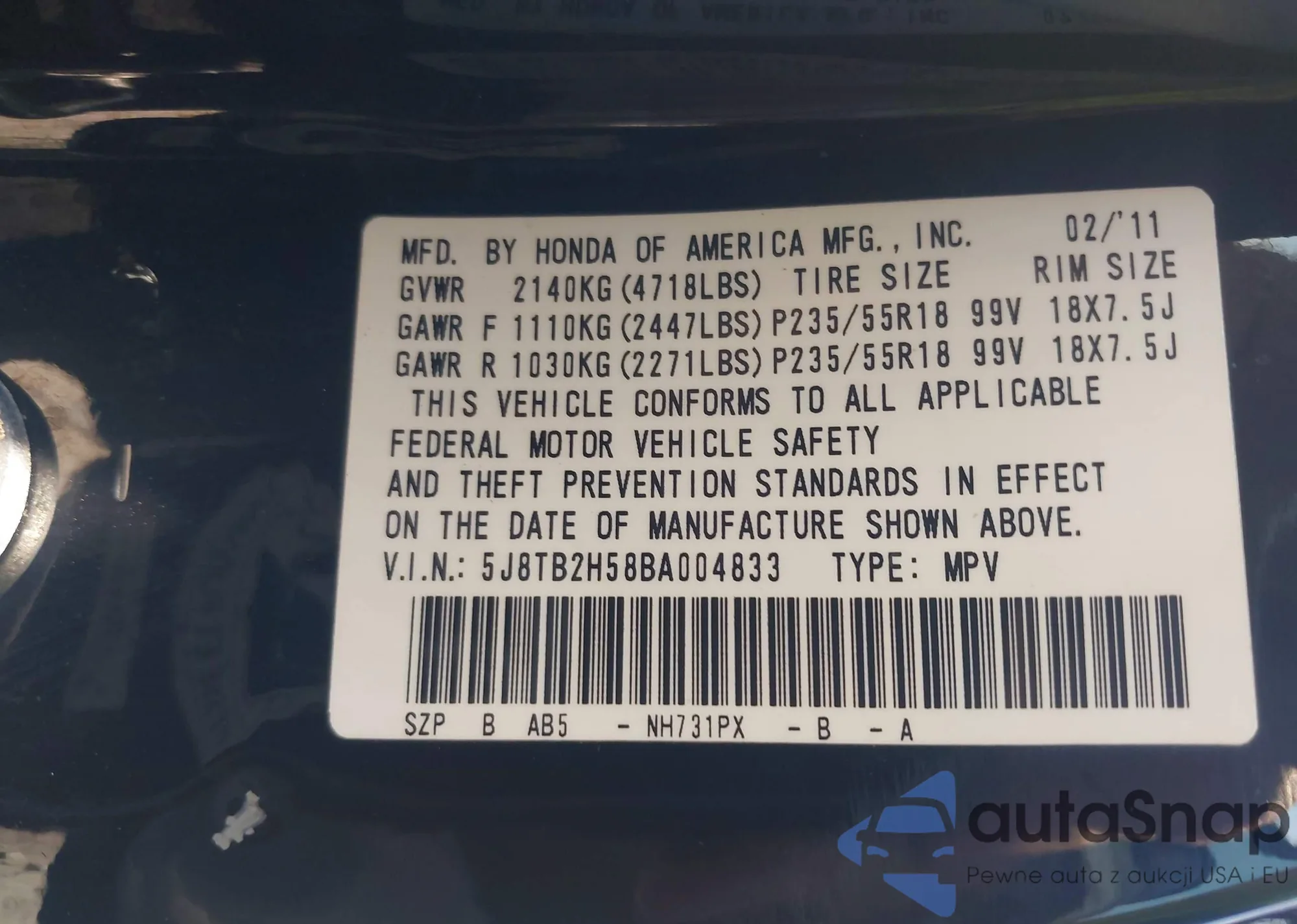 • VIN 5J8TB2H58BA004833