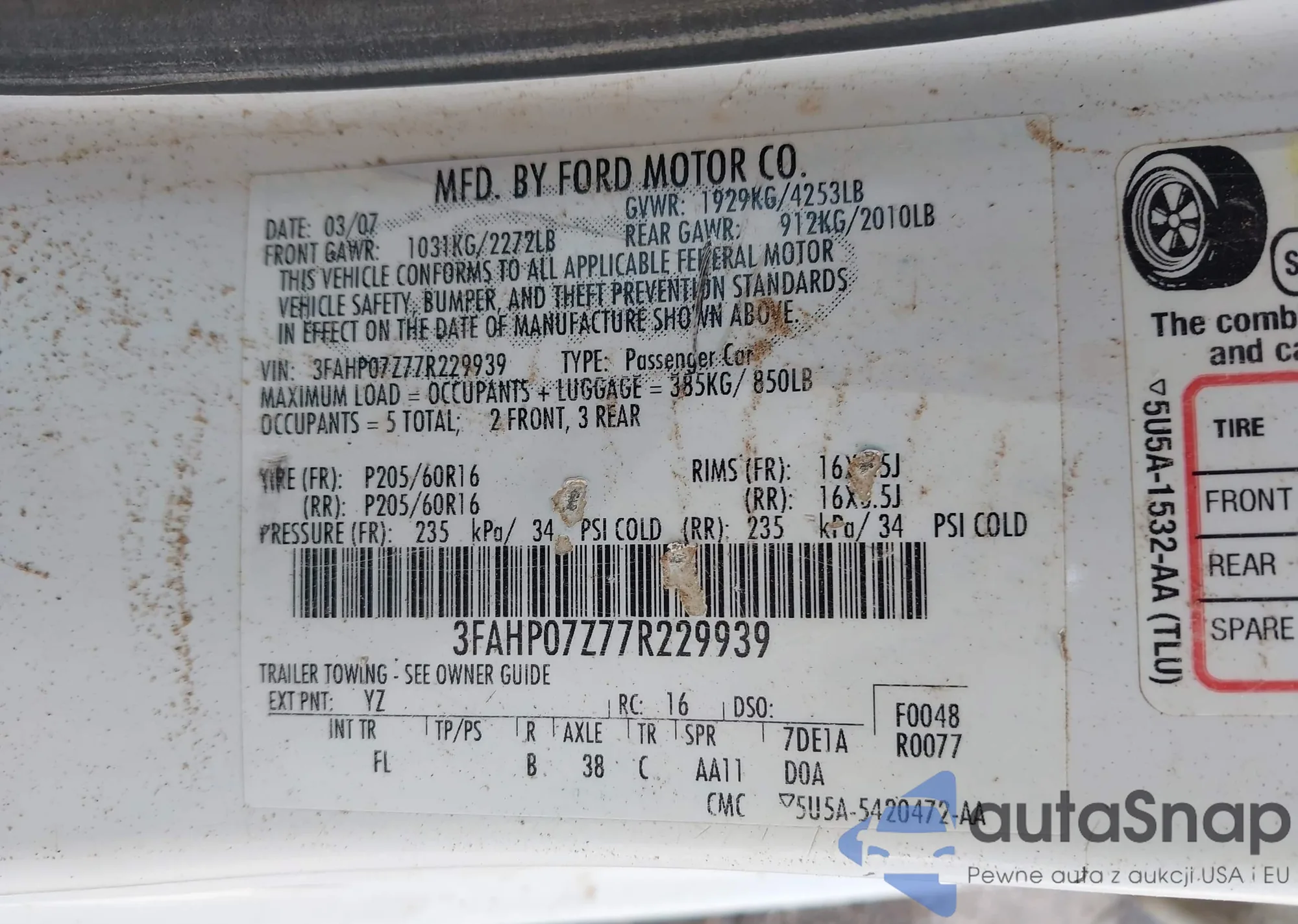 LOT: 42863806 VIN: 3FAHP07Z77R229939
