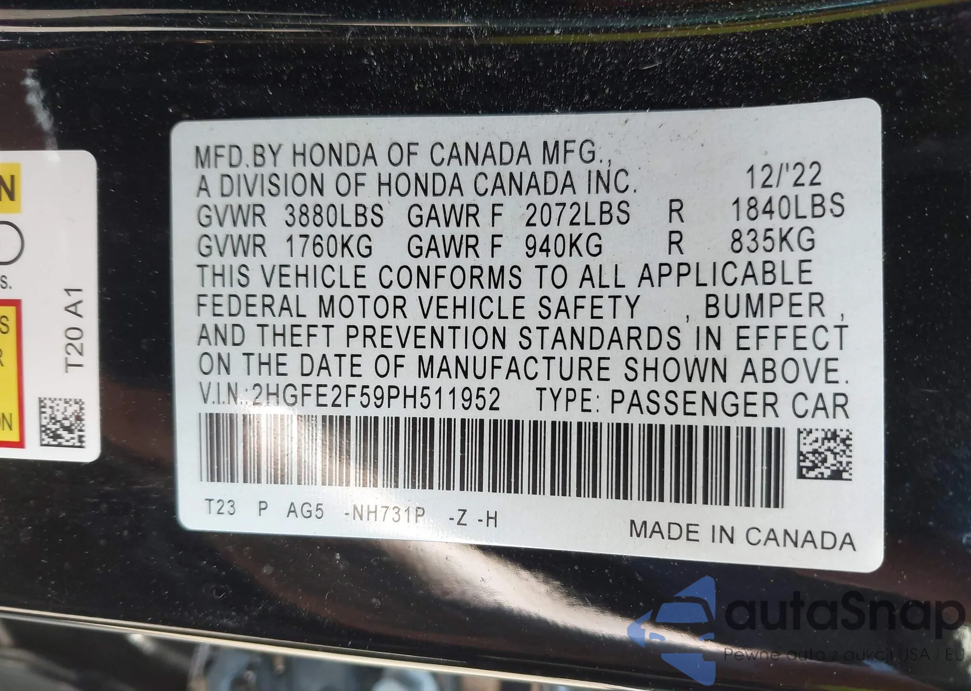 LOT: 42406146 VIN: 2HGFE2F59PH511952