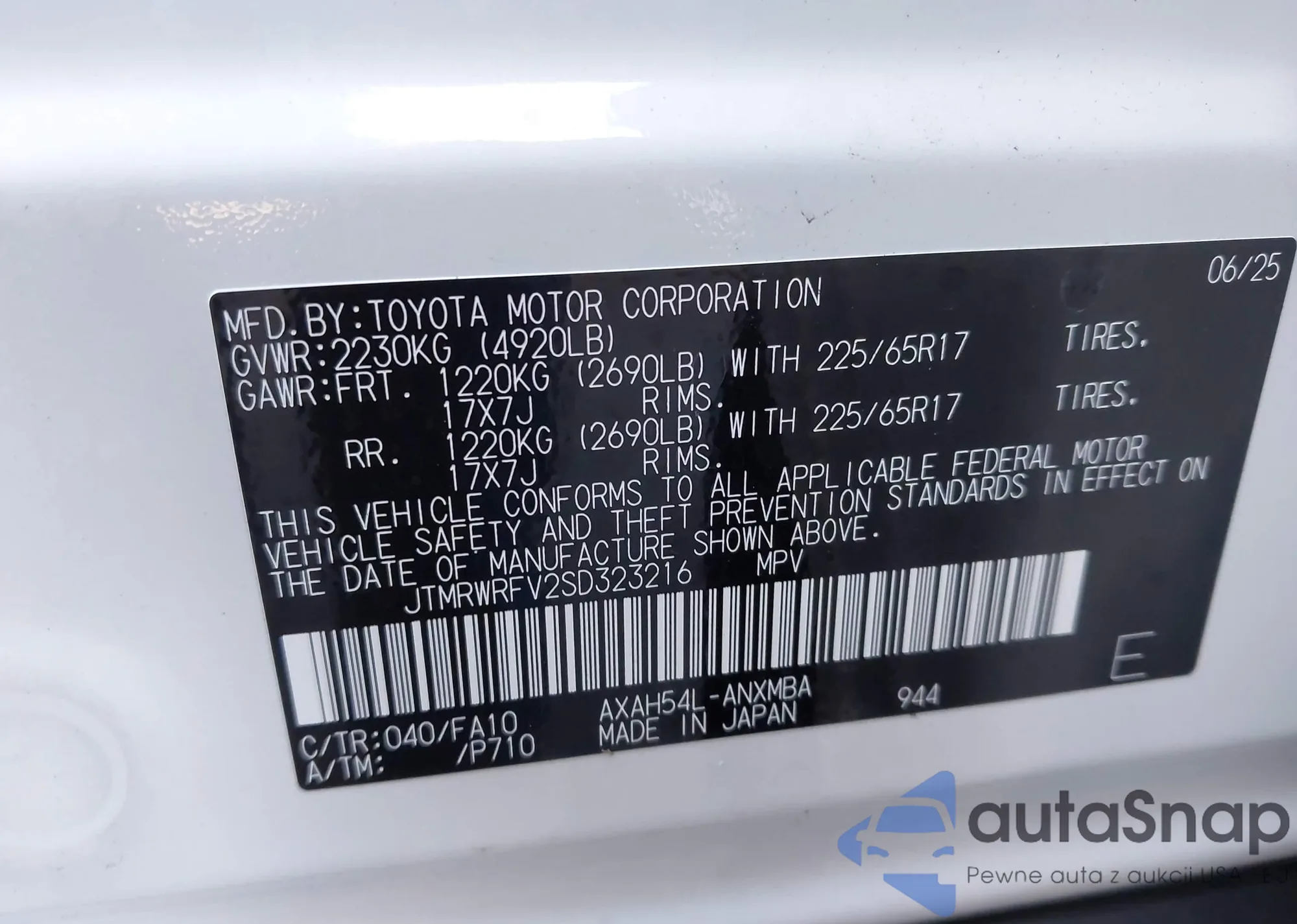 LOT: 43468728 VIN: JTMRWRFV2SD323216