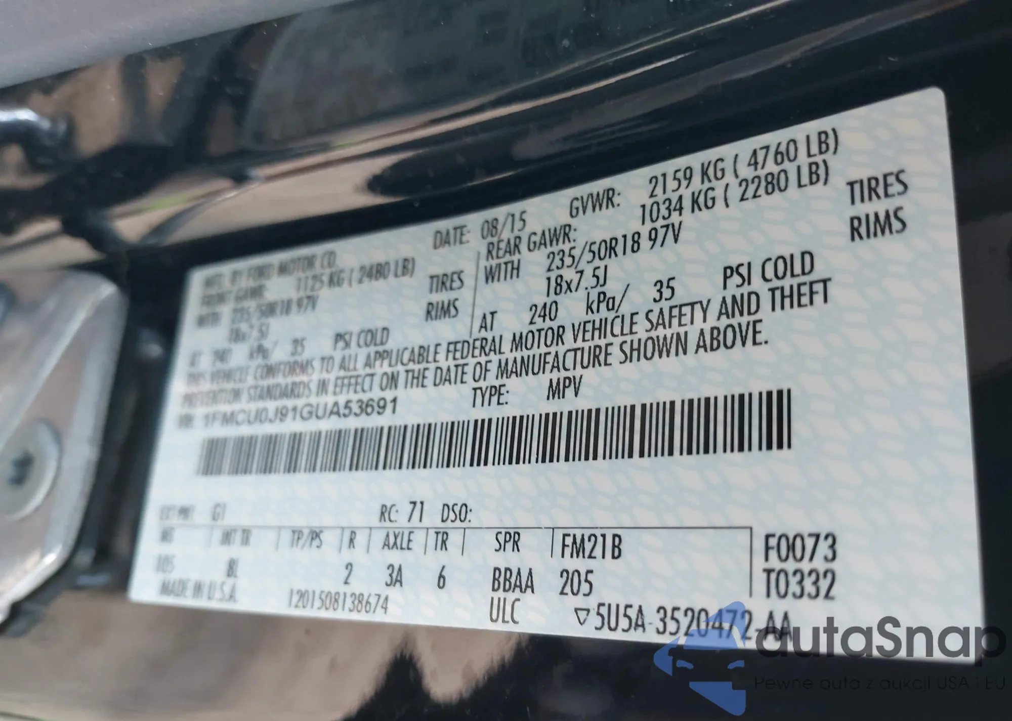 LOT: 43190375 VIN: 1FMCU0J91GUA53691