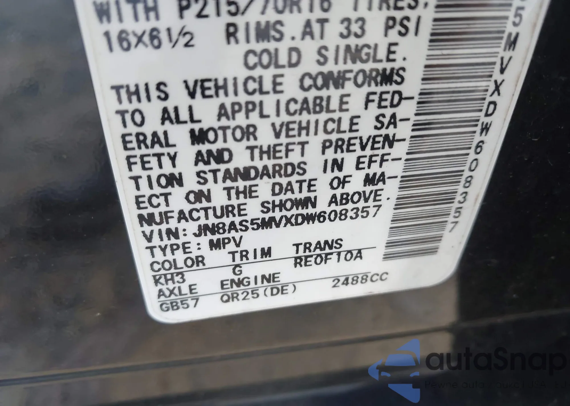 LOT: 43518908 VIN: JN8AS5MVXDW608357