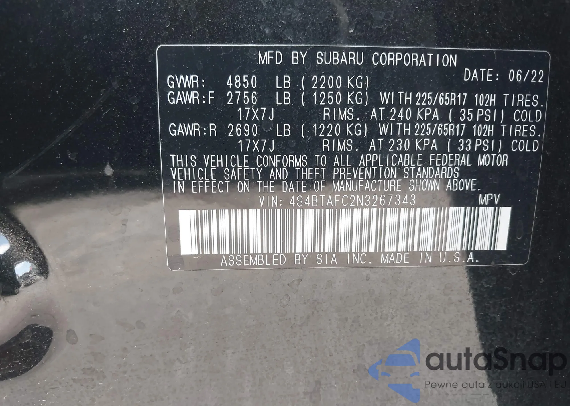 LOT: 43087842 VIN: 4S4BTAFC2N3267343