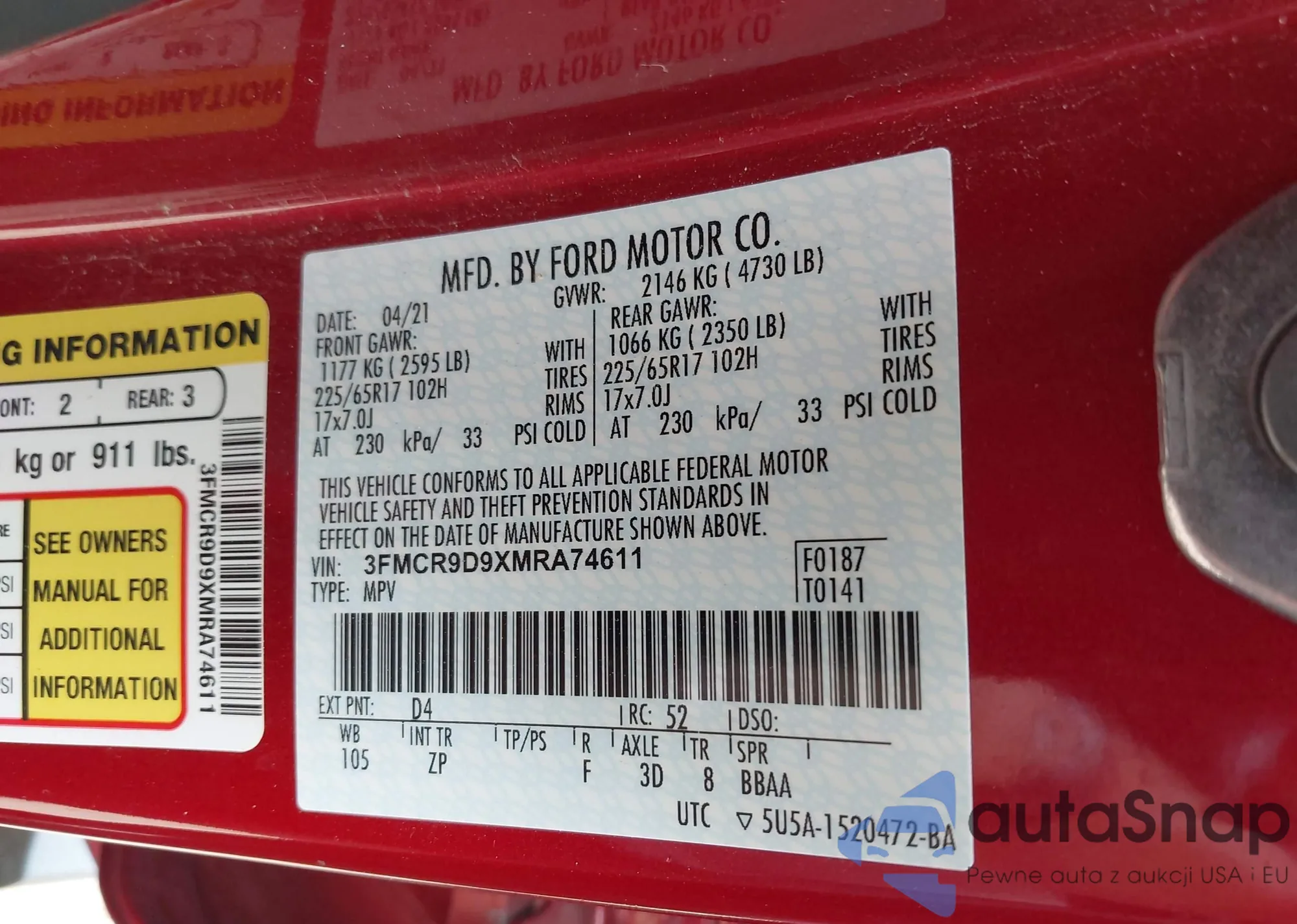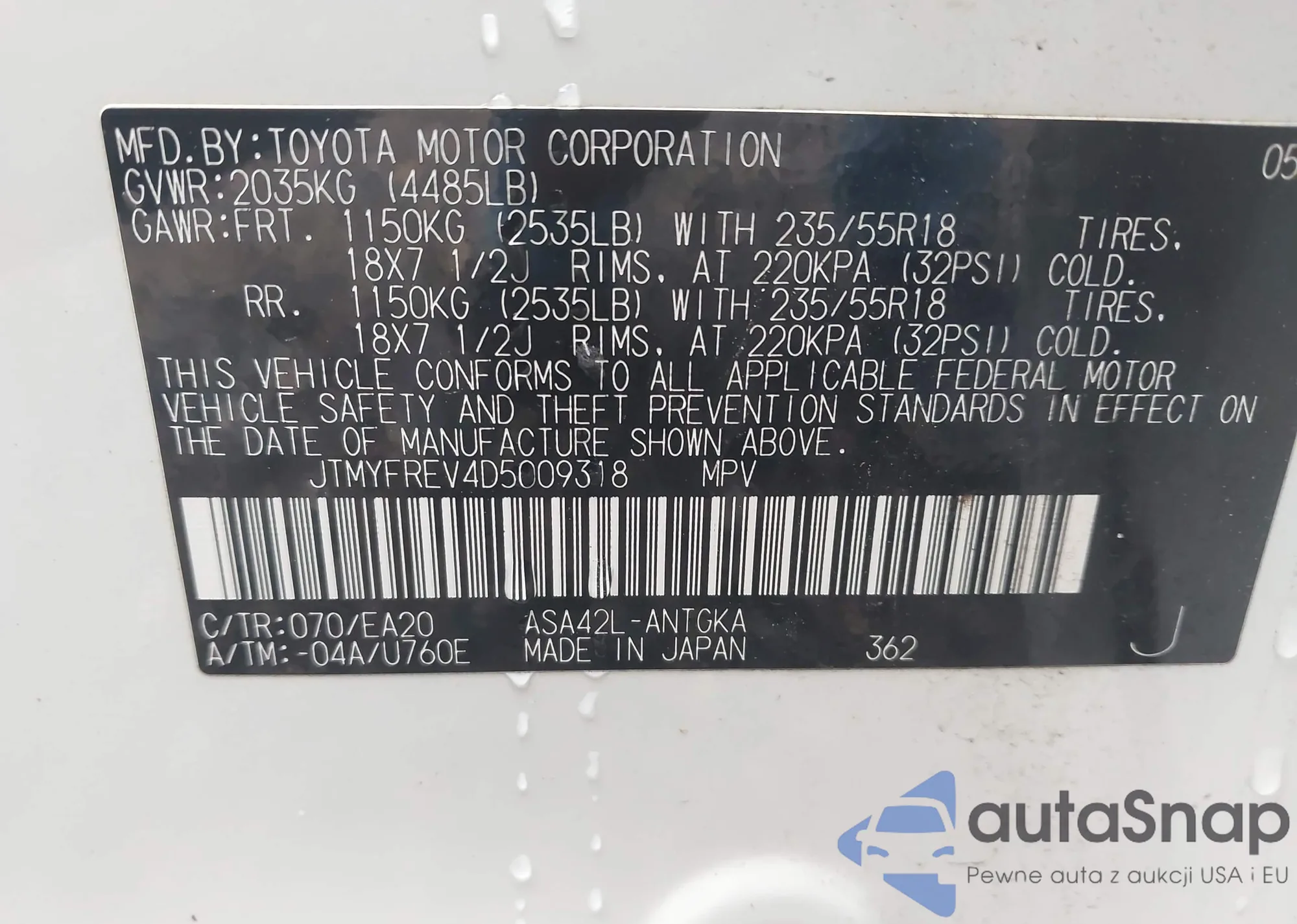 LOT: 43135435 VIN: JTMYFREV4D5009318