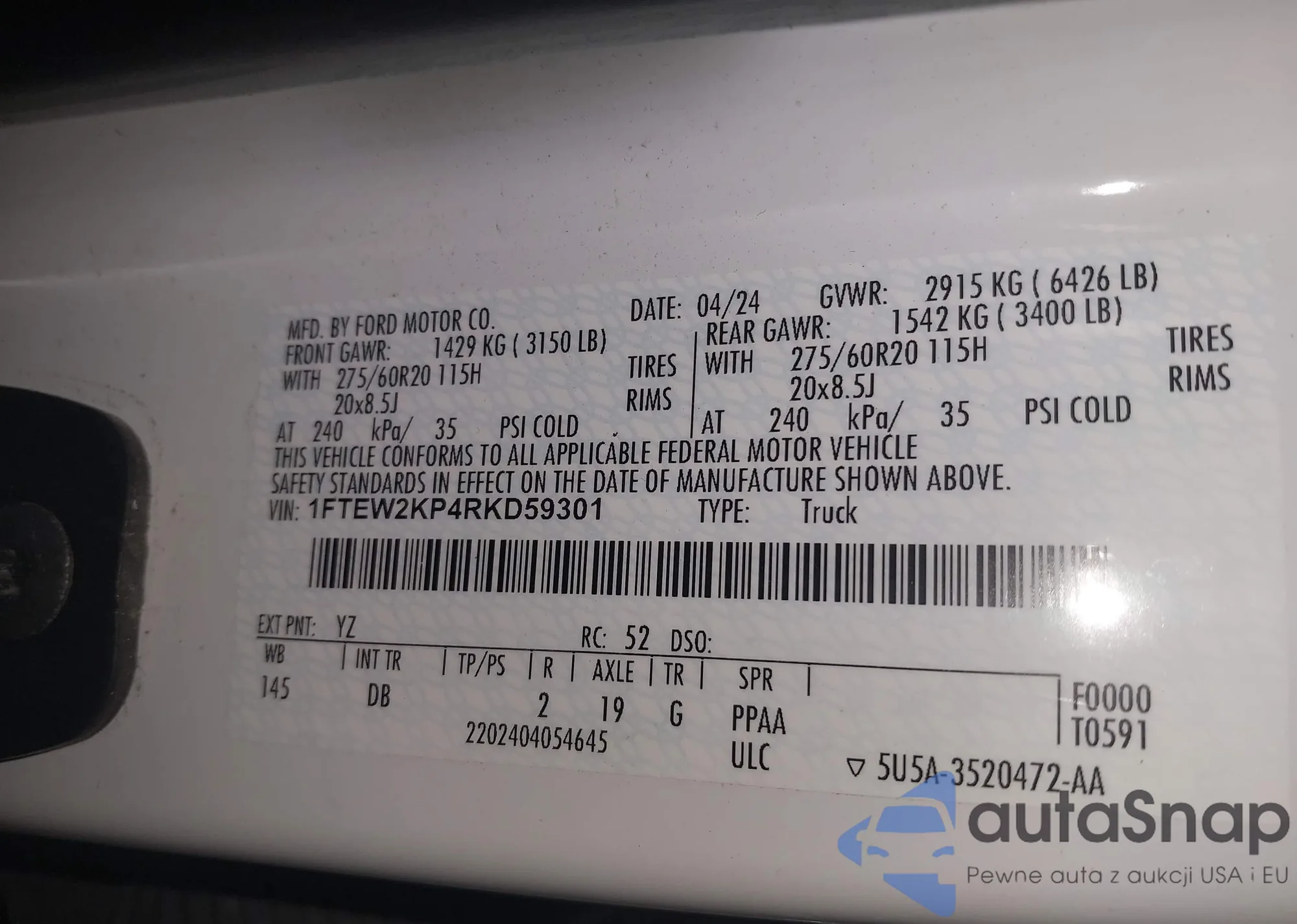 LOT: 42804328 VIN: 1FTEW2KP4RKD59301