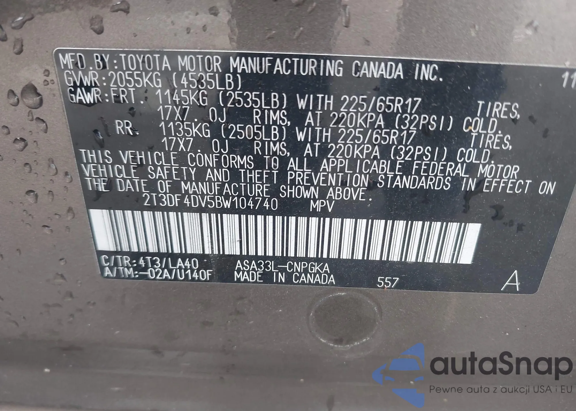 • VIN 2T3DF4DV5BW104740