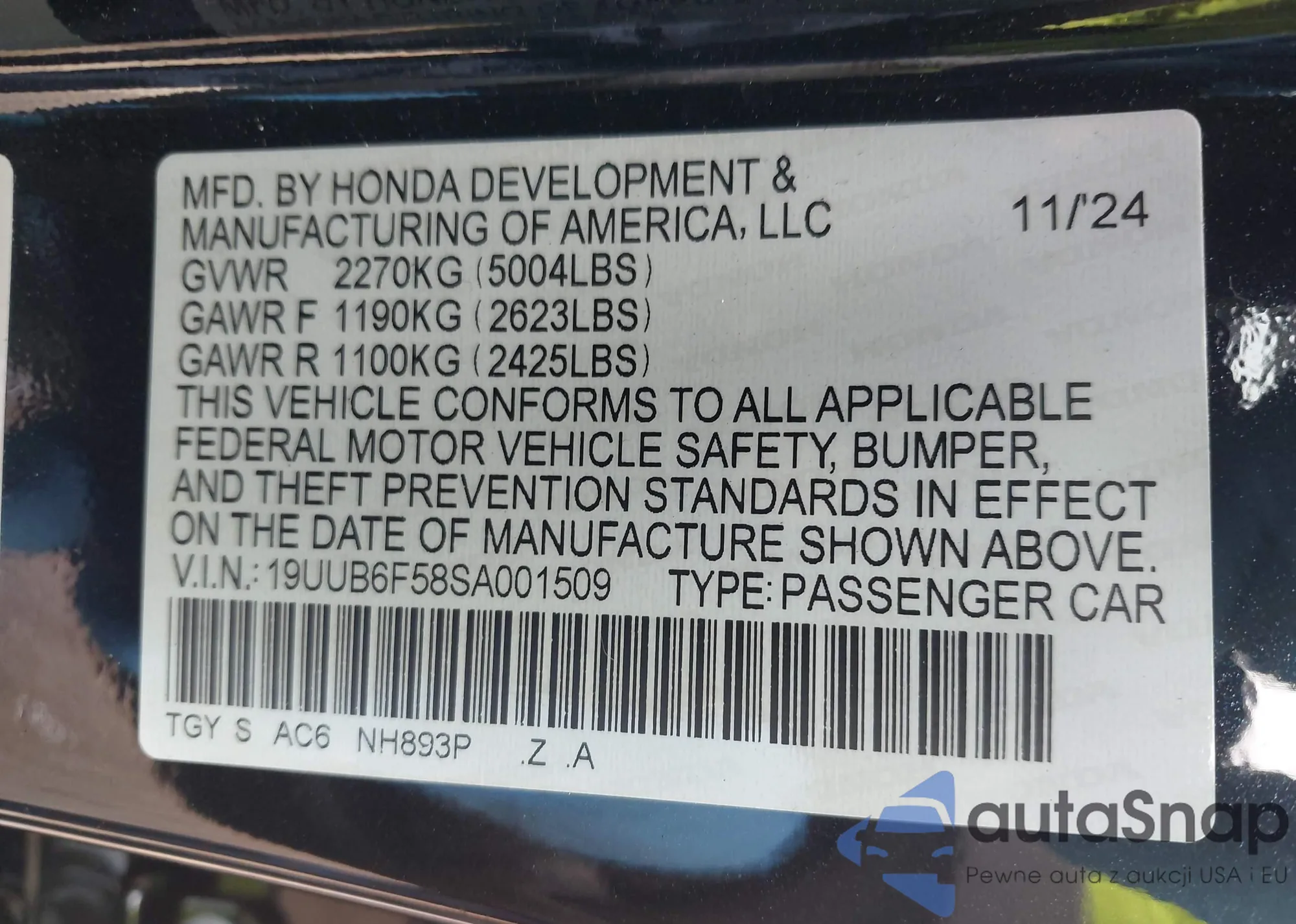 • VIN 19UUB6F58SA001509