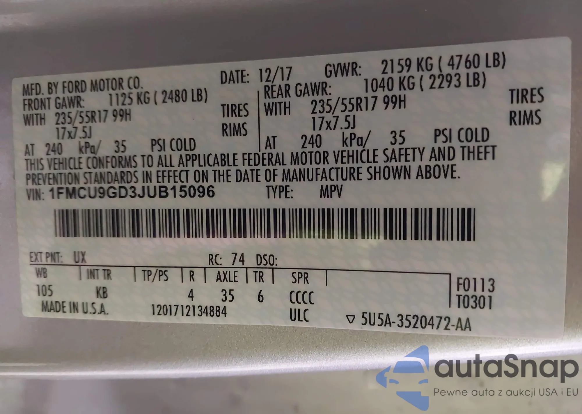 • VIN 1FMCU9GD3JUB15096