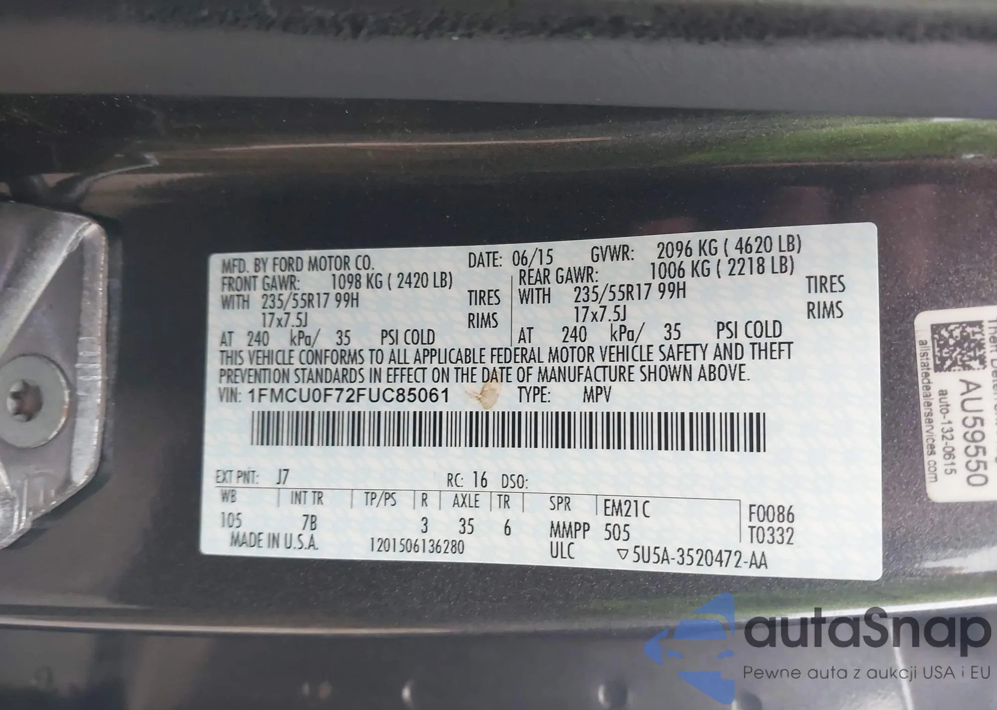 • VIN 1FMCU0F72FUC85061