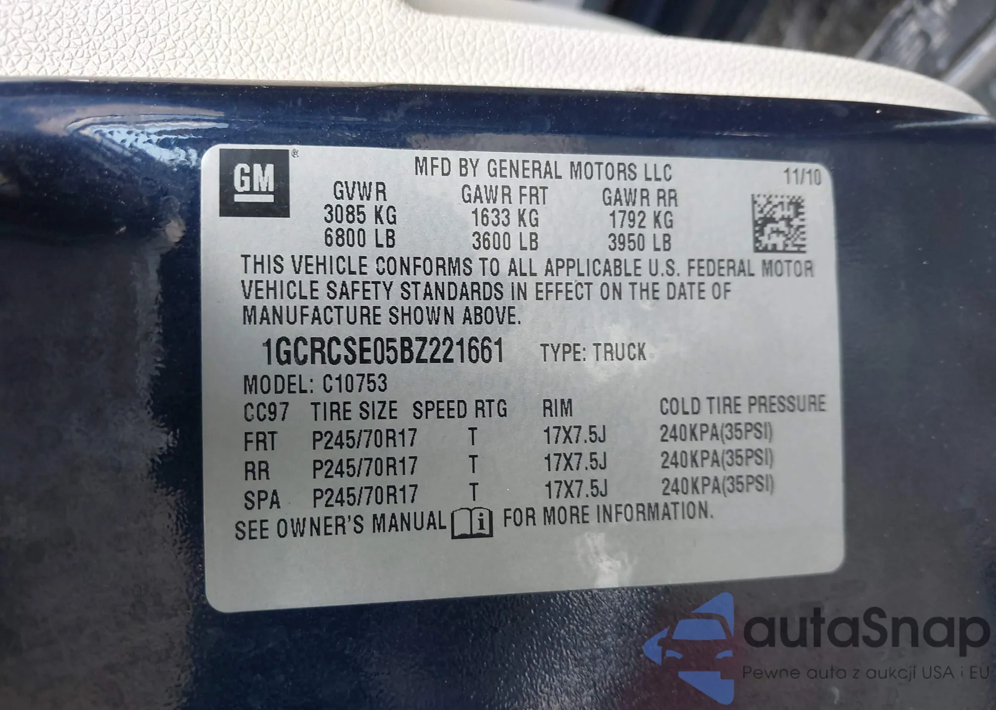 LOT: 42952141 VIN: 1GCRCSE05BZ221661