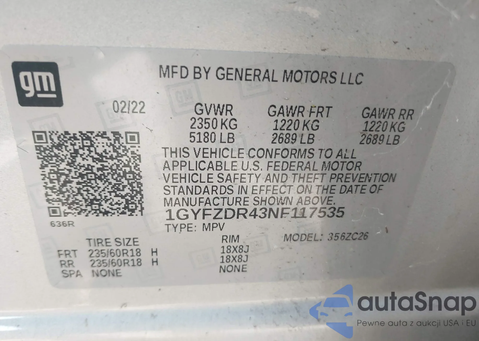 • VIN 1GYFZDR43NF117535