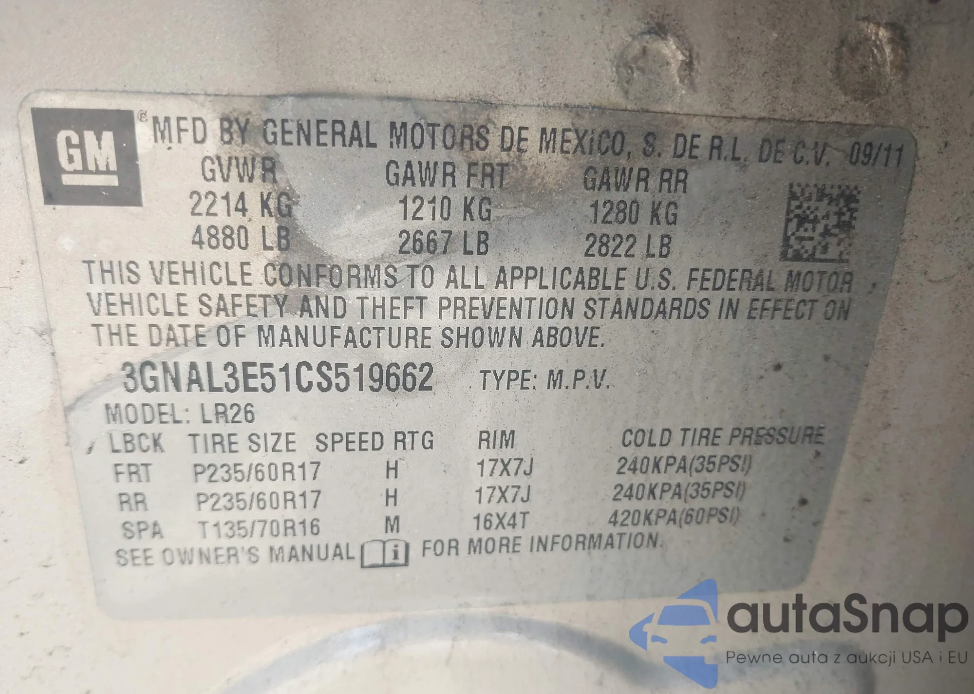 LOT: 42965023 VIN: 3GNAL3E51CS519662