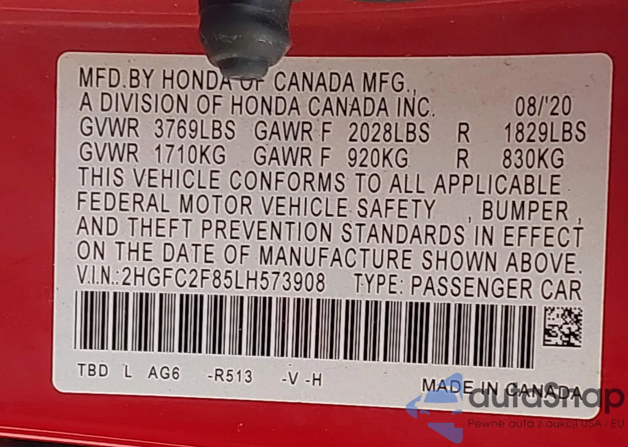 • VIN 2HGFC2F85LH573908