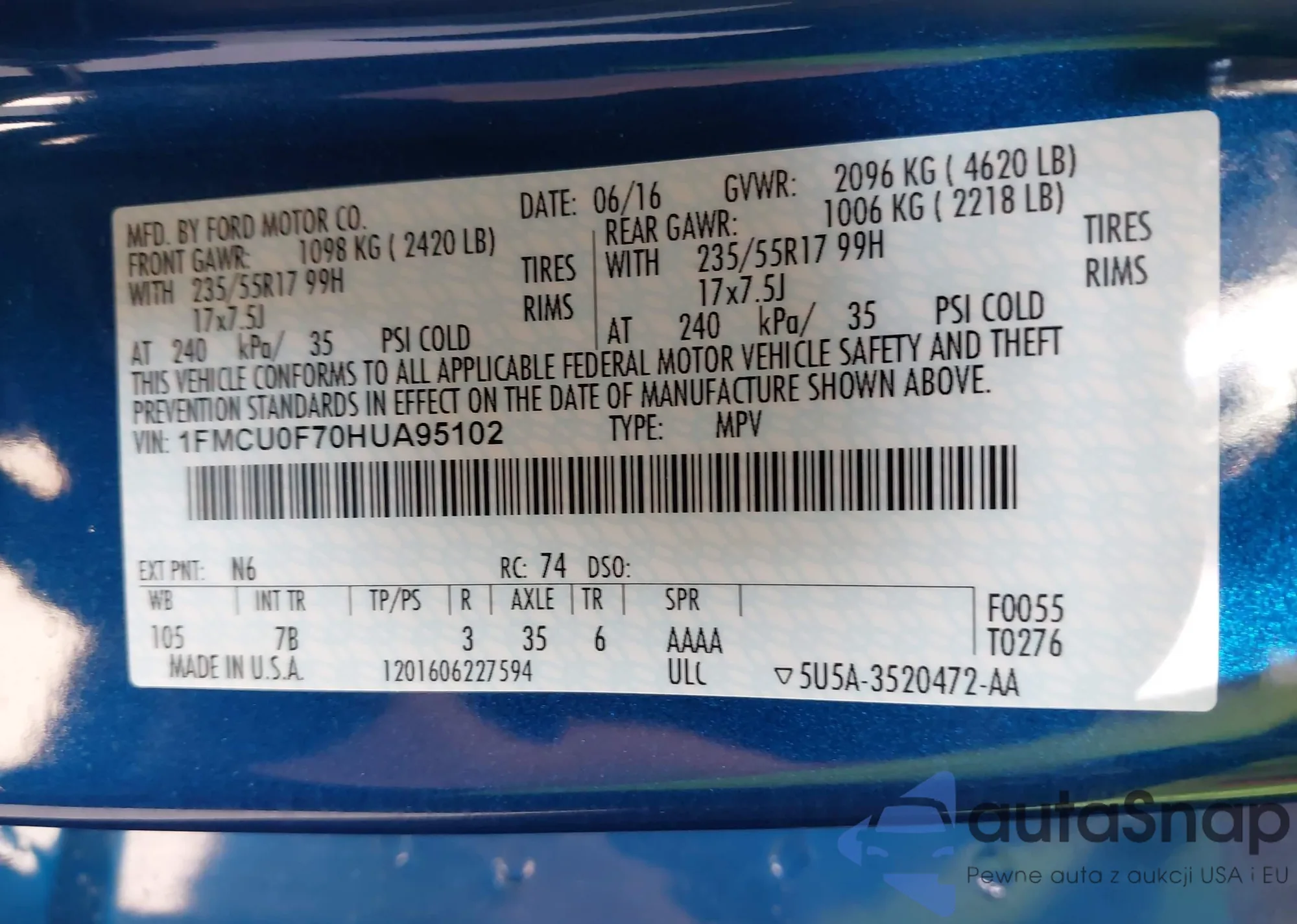 LOT: 43295054 VIN: 1FMCU0F70HUA95102