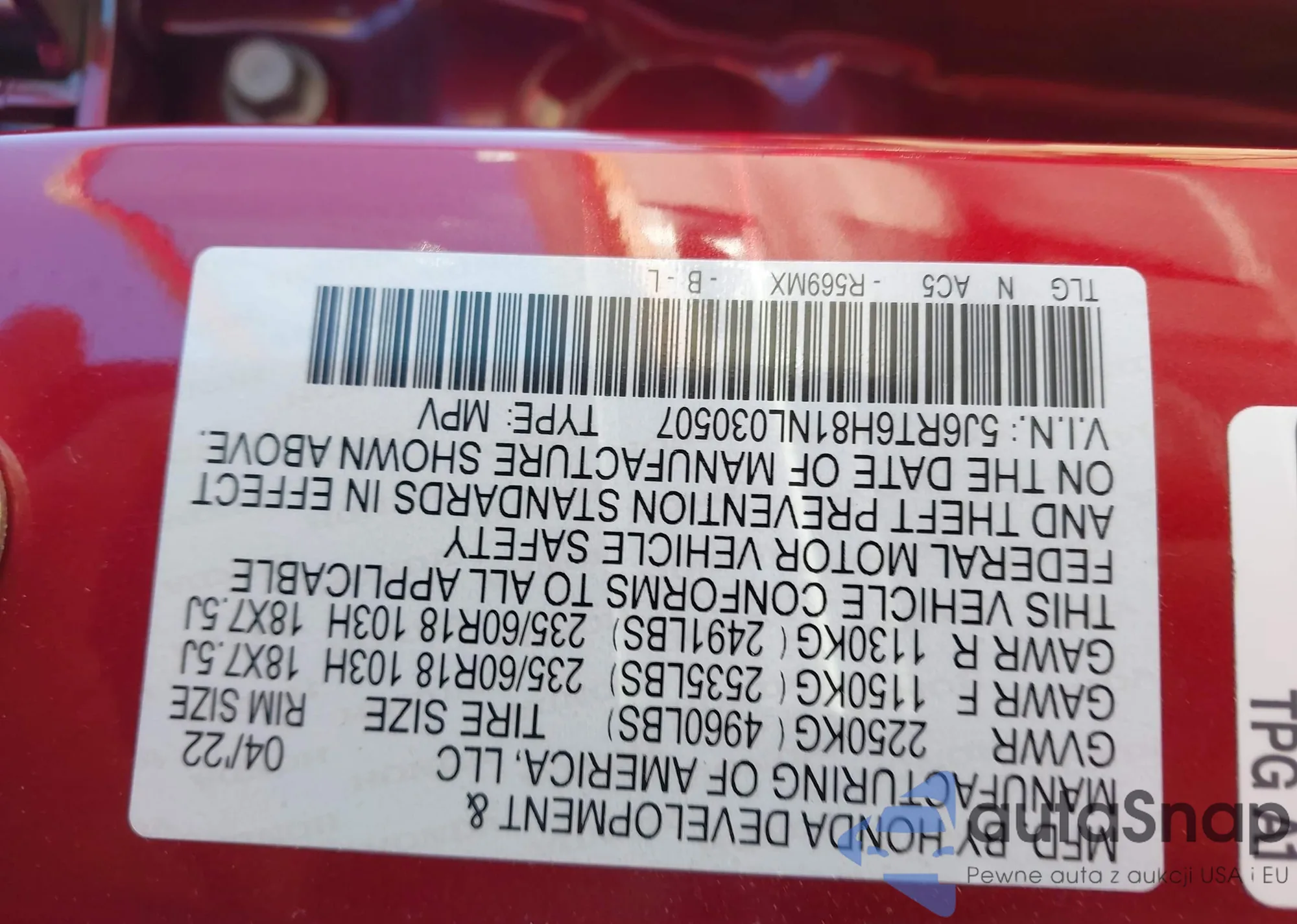 • VIN 5J6RT6H81NL030507