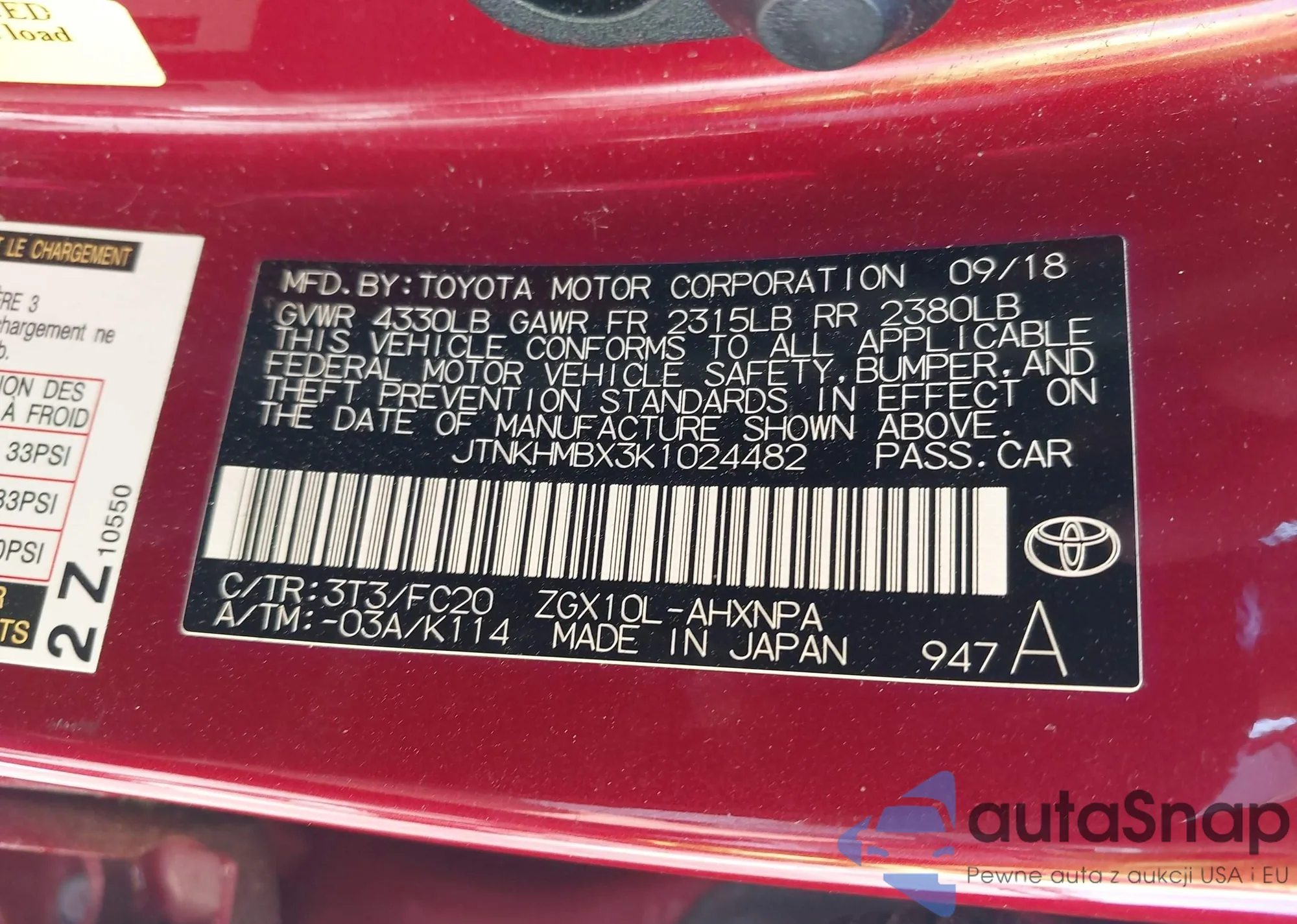 LOT: 43338133 VIN: JTNKHMBX3K1024482