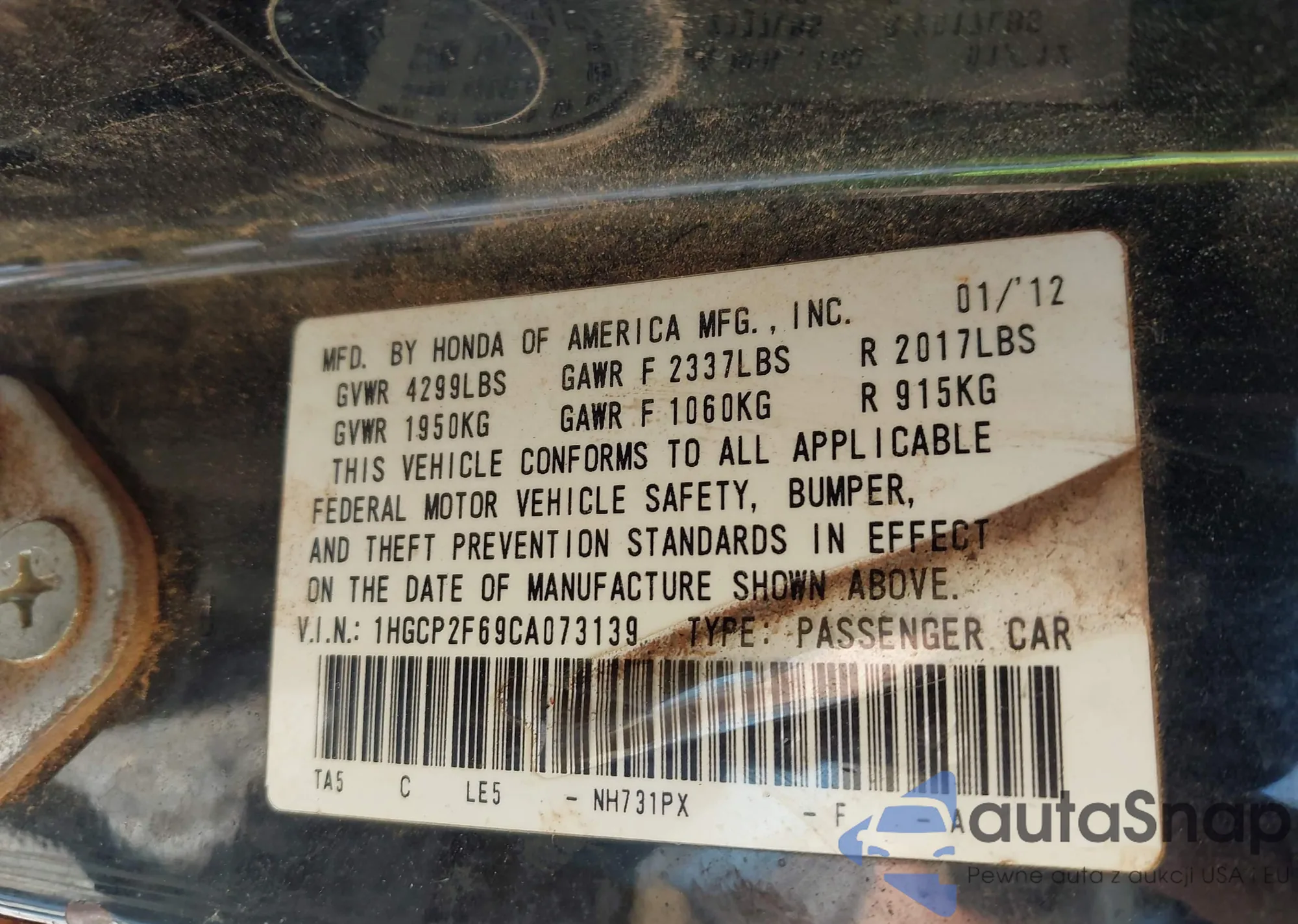 LOT: 43333457 VIN: 5J6RT6H81NL030507