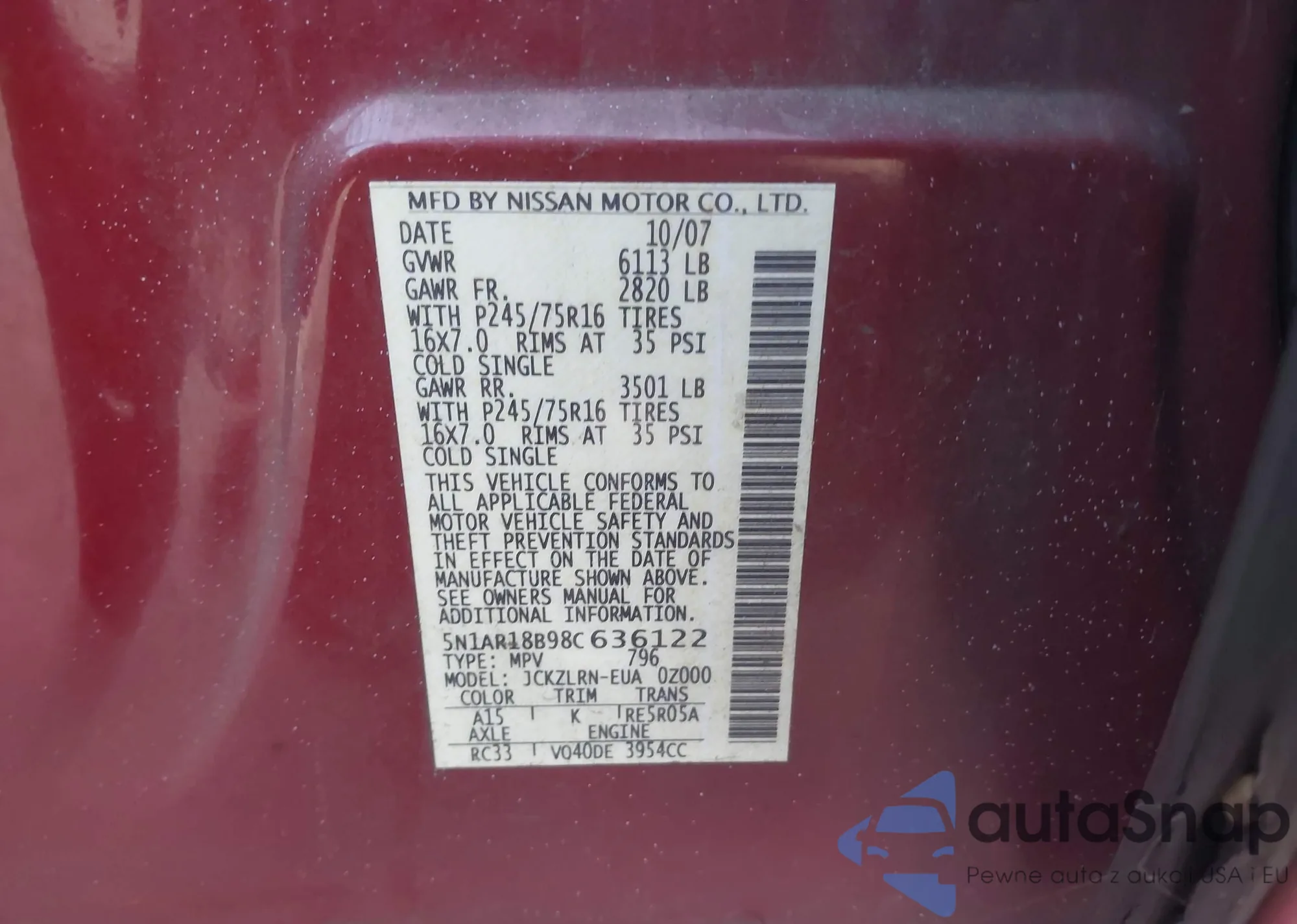 • VIN 5N1AR18B98C636122