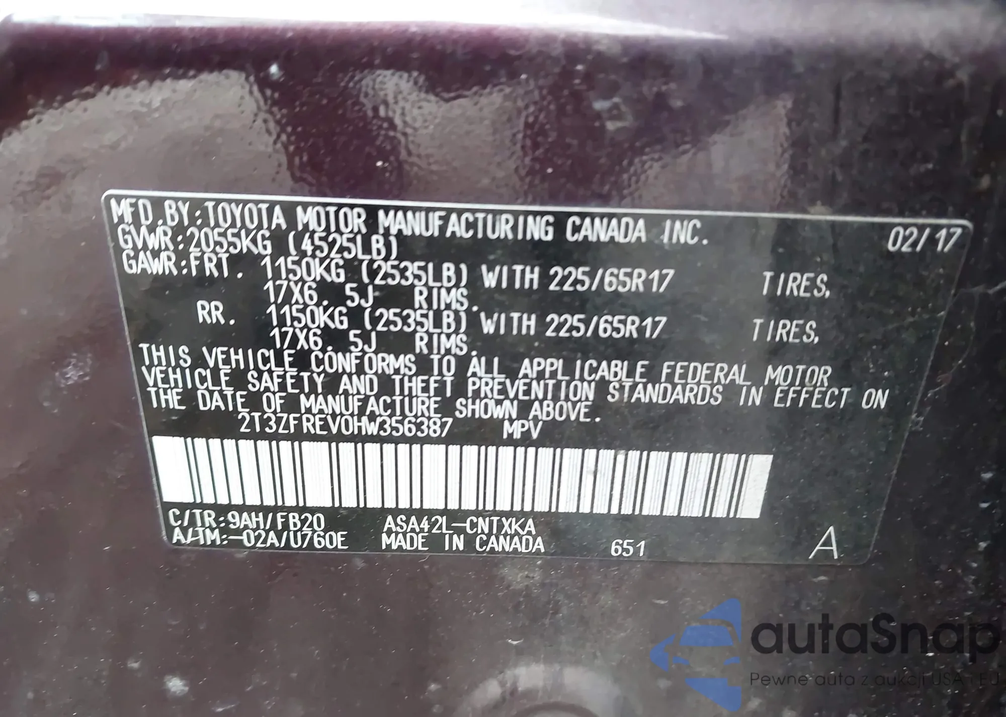 LOT: 43589889 VIN: 2T3ZFREV0HW356387