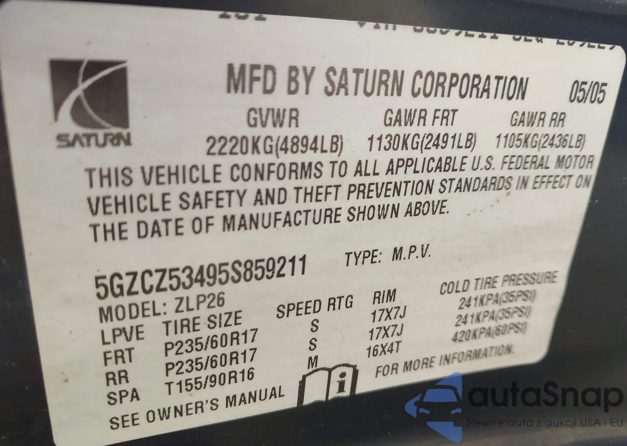 • VIN 5GZCZ53495S859211
