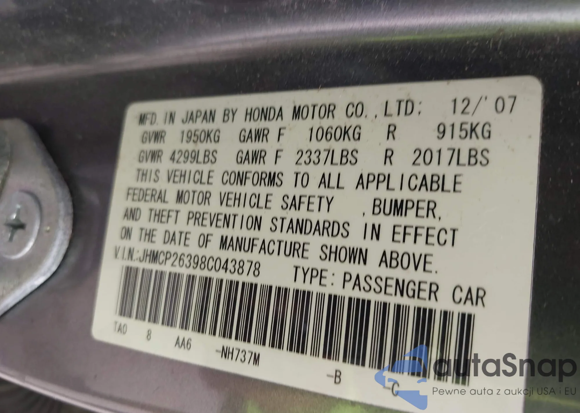 • VIN JHMCP26398C043878
