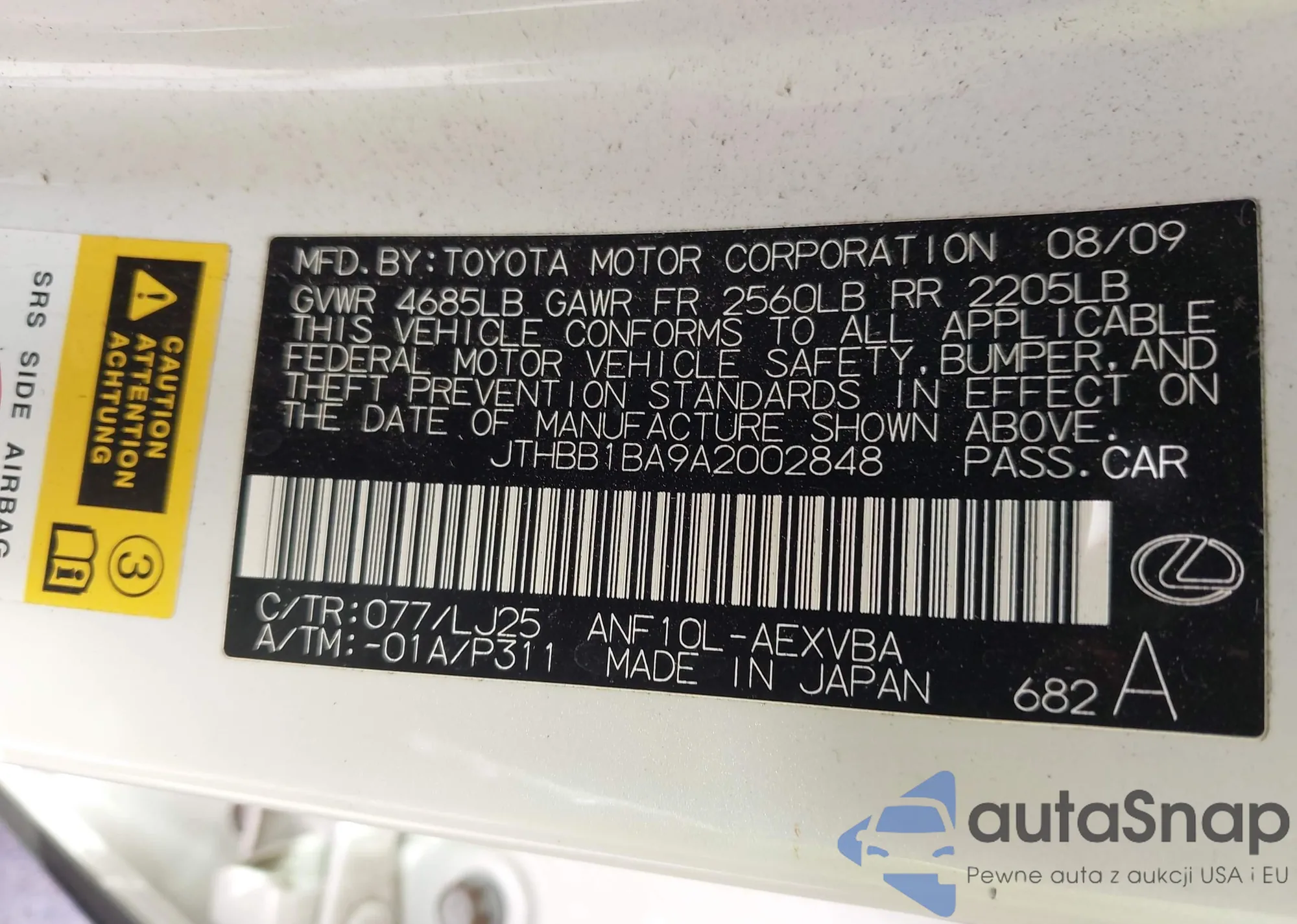 • VIN JTHBB1BA9A2002848