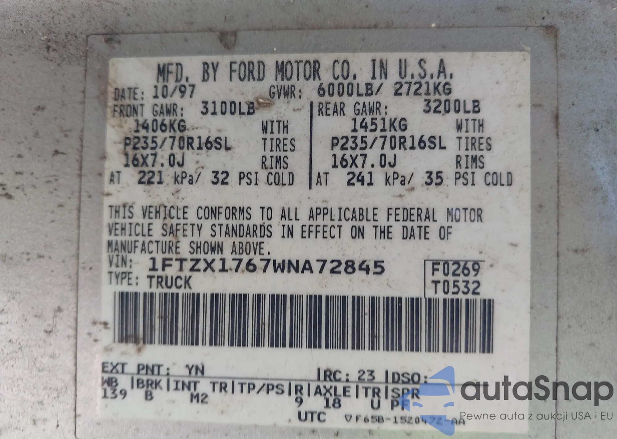 LOT: 43474246 VIN: 1FTZX1767WNA72845