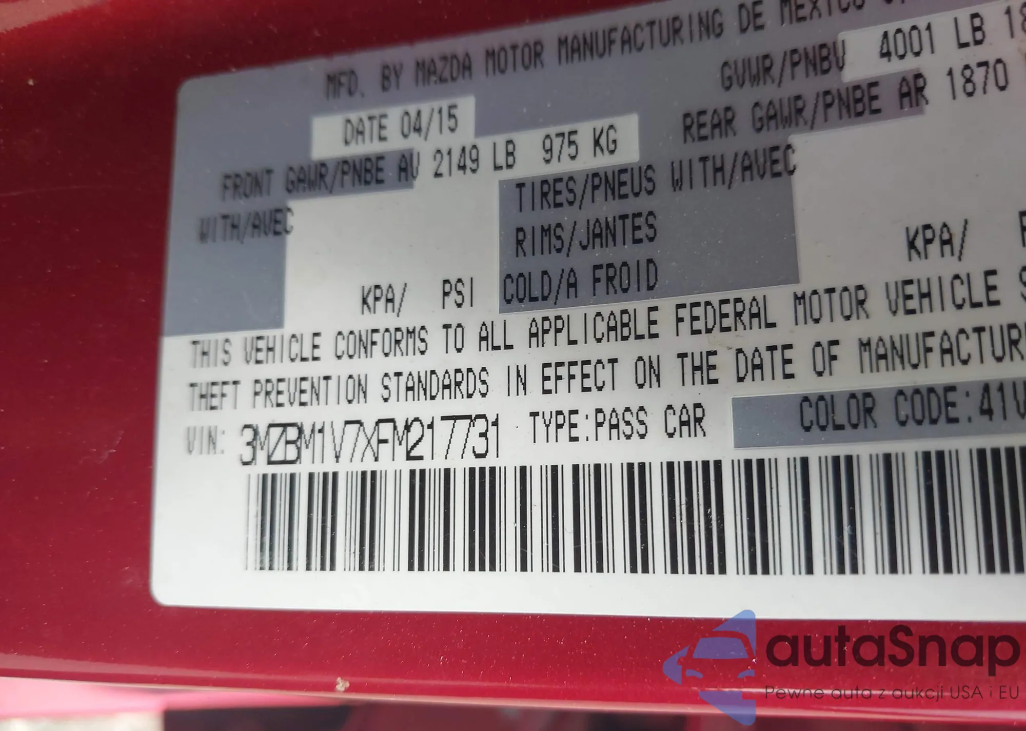 LOT: 43194915 VIN: 3MZBM1V7XFM217731