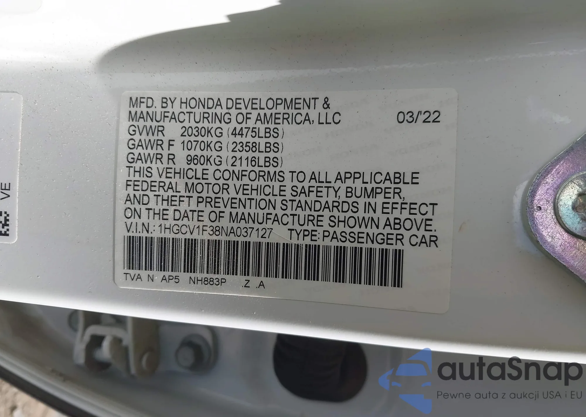 LOT: 43203969 VIN: 1HGCV1F38NA037127