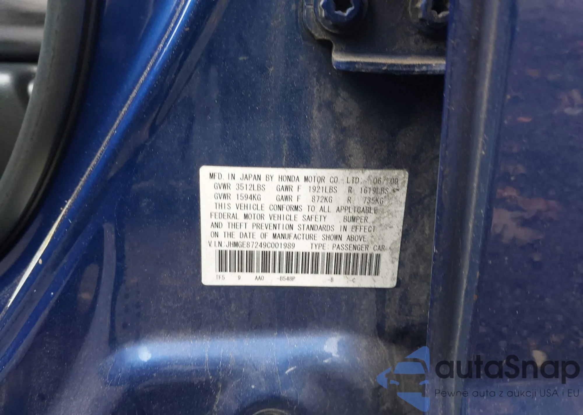 LOT: 43437130 VIN: JHMGE87249C001989
