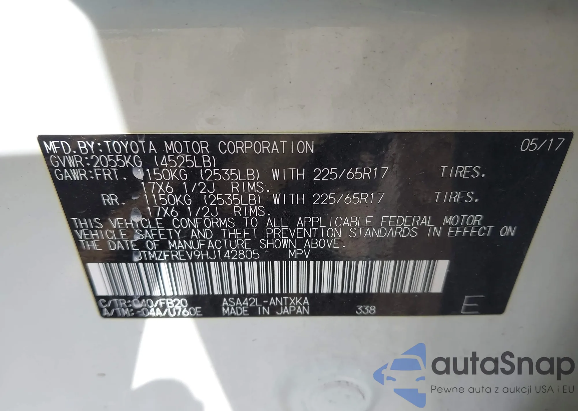 LOT: 43335426 VIN: JTMZFREV9HJ142805