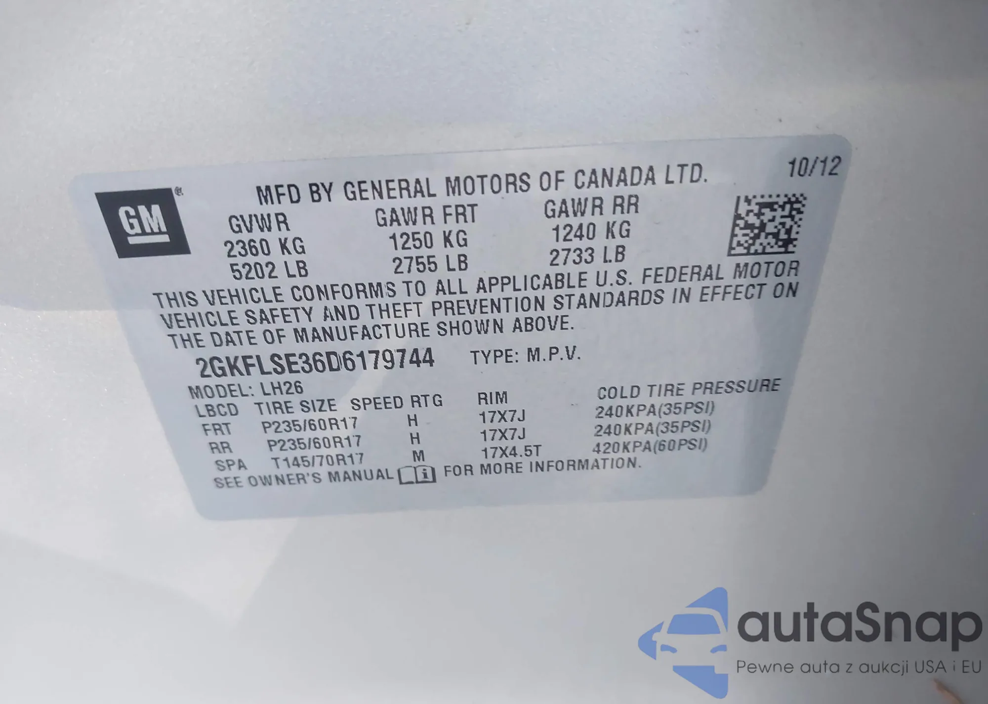 LOT: 43494452 VIN: 2GKFLSE36D6179744